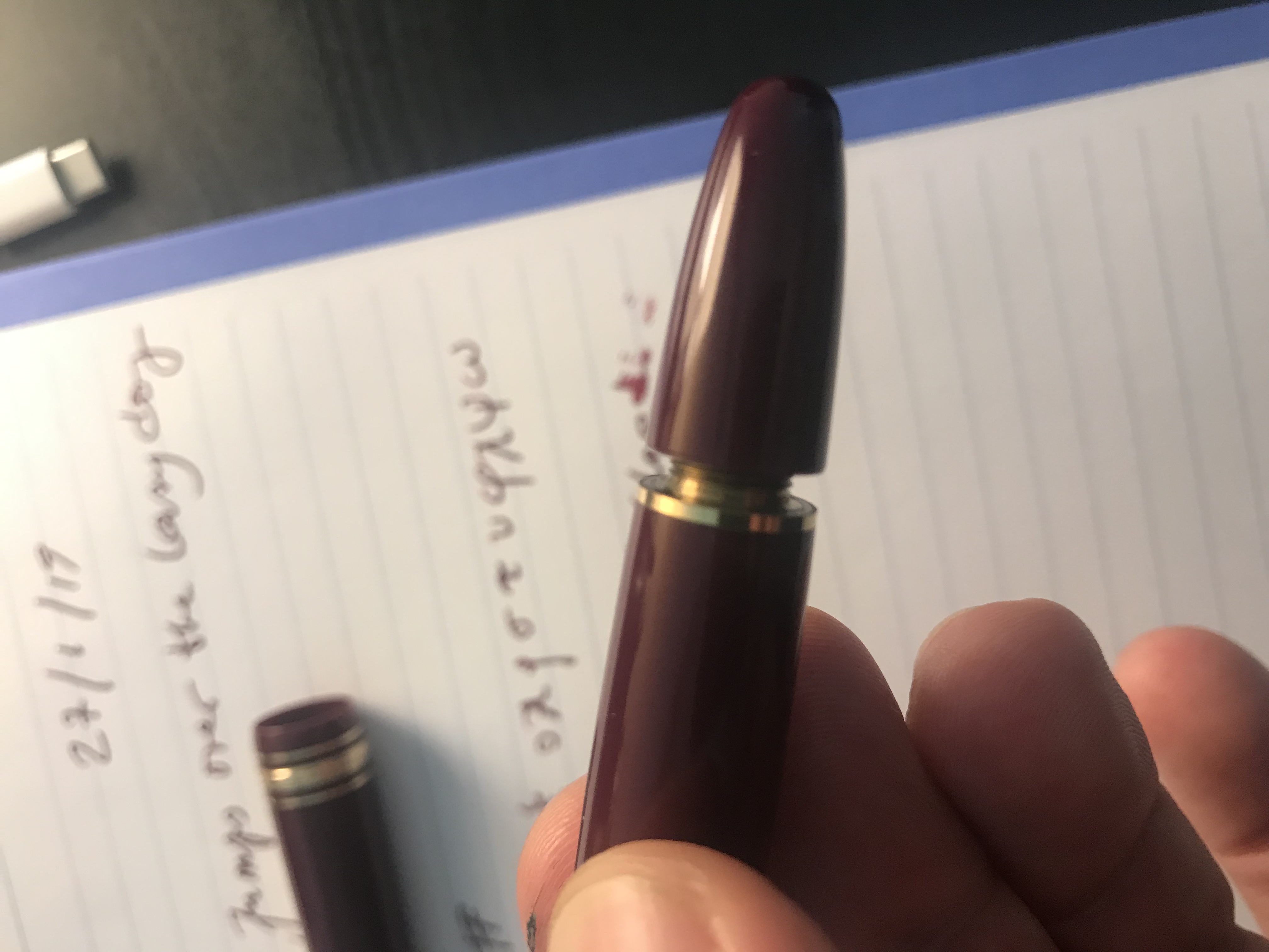 Riguardo alla penna in se', la sensazione e' buona e il peso adeguato. Ho due dubbi da sciogliere: l'anellino del cappuccio (non la vera) e quello del fondello non sono perfettamente allo stesso livello con la resina, e la clip non presenta la scritta Pix all'interno.