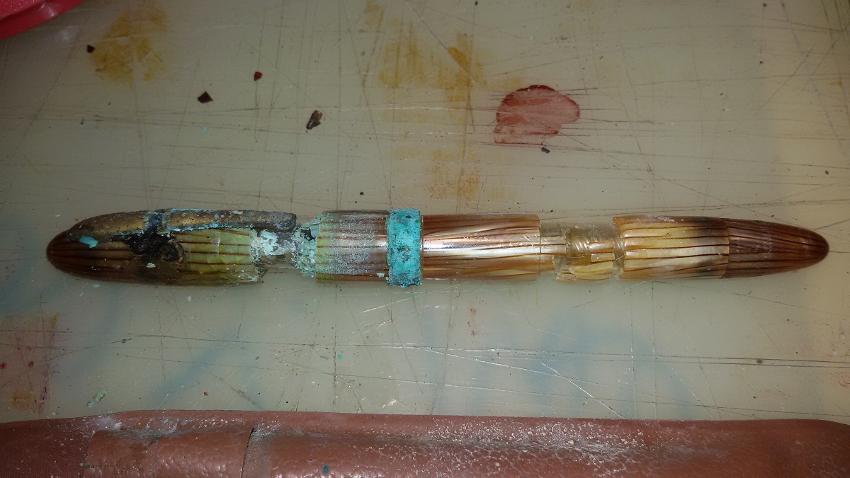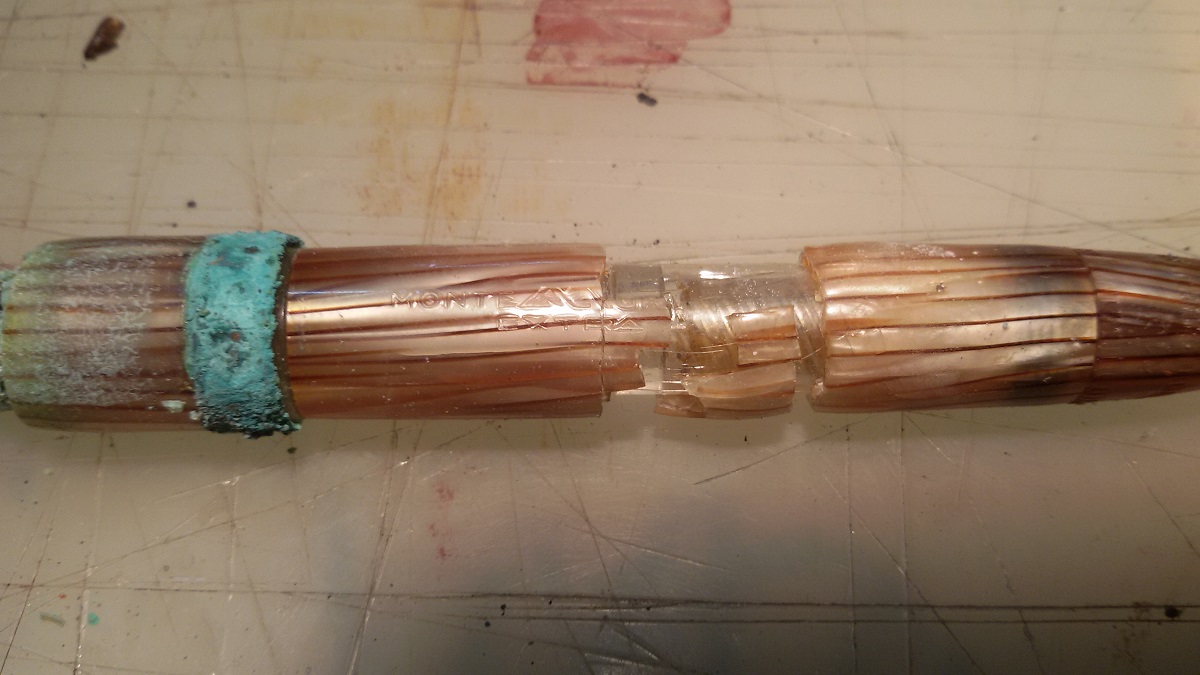 Quanto successo è raccapricciante! Anche a me è successa una cosa simile con una penna appena comprata che si è sbriciolata alla prima pulitura: dentro la celluloide era cristallizzata come la tua. Ho letto su un libro che talvolta il processo di stagionatura della celluloide era di proposito abbreviato dai produttori per esigenze di mercato, con gli effetti che vediamo diversi decenni dopo..