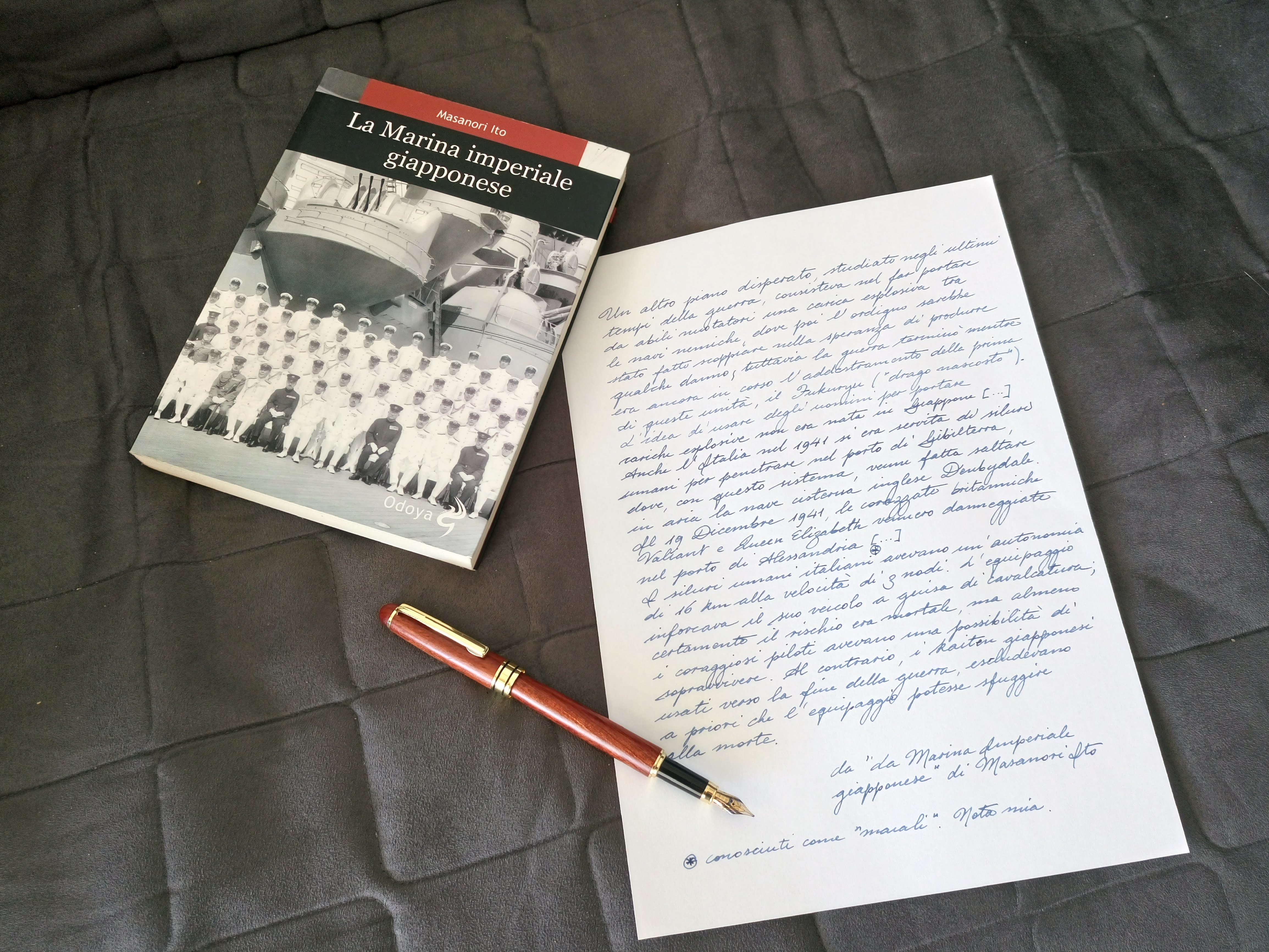 E ora andiamo a provarla. La penna ha un pennino preciso, scorrevole, ma il flusso io lo trovo veramente troppo magro, al punto che fa fatica a scorrere. Ho provato un poco a lavorare sul pennino, ma mi dà l'idea che quello sia innocente. Osservato con la lente 30x, infatti, risulta perfettamente allineato. L'inchiostro che ho usato è il Pelikan 4001 blu/nero, forse non il massimo come scorrevolezza. Dovrei riprovare col Blu Royal. Ad ogni modo ha fatto il suo lavoro, anche se sono reduce da una settimana di tonsillite feroce, e tra antibiotici e medicine, non ho la mano fermissima come dovrei avere, per cui la grafia è un po' traballante: