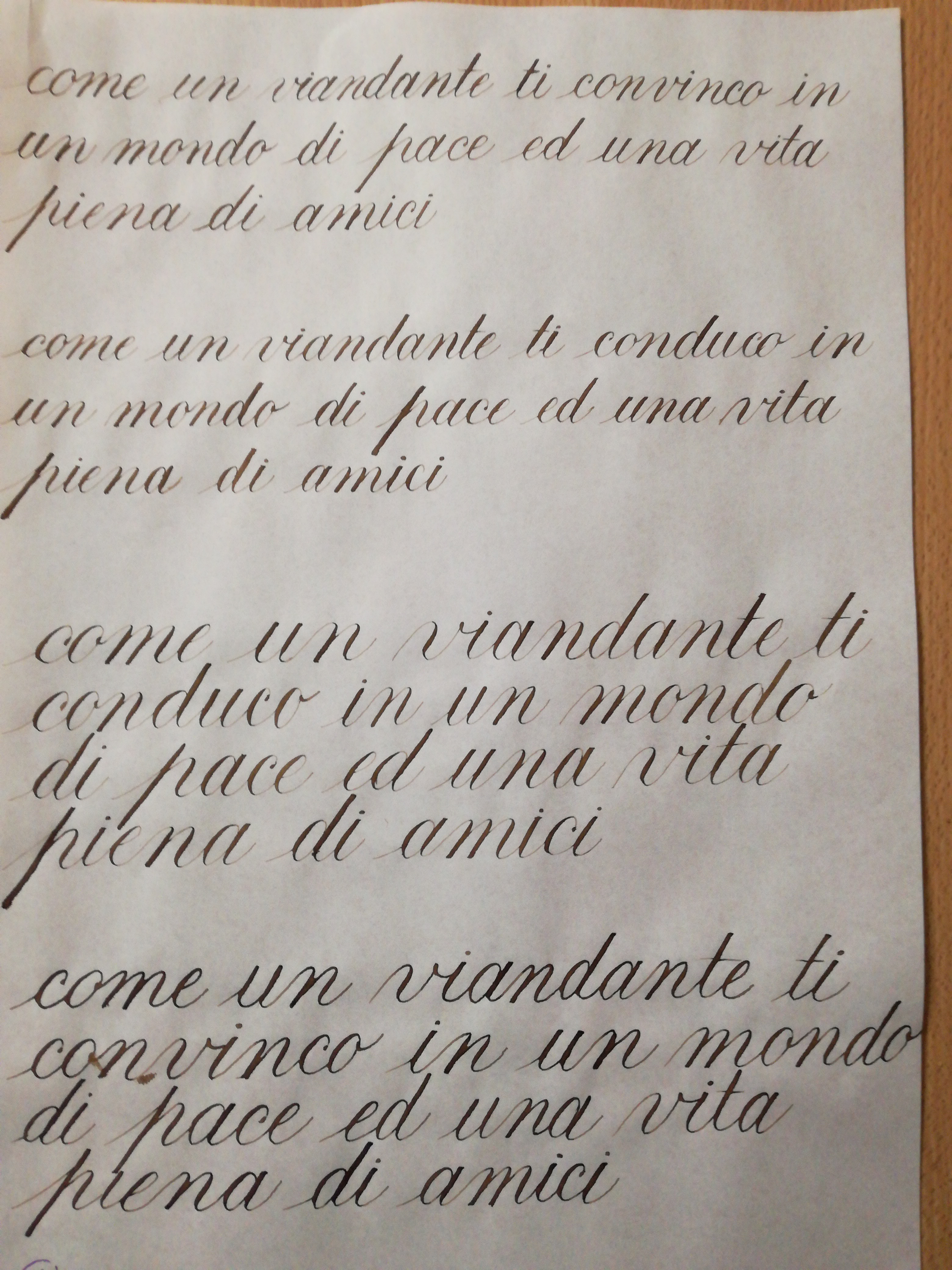 Stormwolfie ha scritto: venerdì 22 febbraio 2019, 19:58 Io ho finito domenica un corso di spencerian semplice con Barbara Calzolari con Nikko G e cannuccia obliqua.