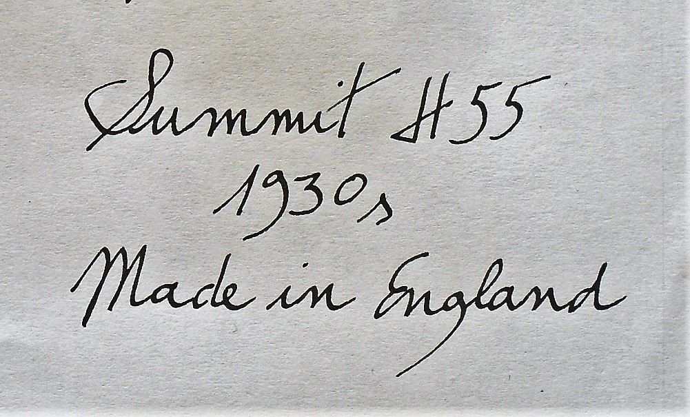 Il corpo riporta l’iscrizione incisa tipica dei modelli Summit della prima parte degli anni Trenta; disposta su tre livelli, recitava: “Summit – London unbreakable Liverpool – Curzons Ltd”. Il numero del modello è inciso sul fondello.