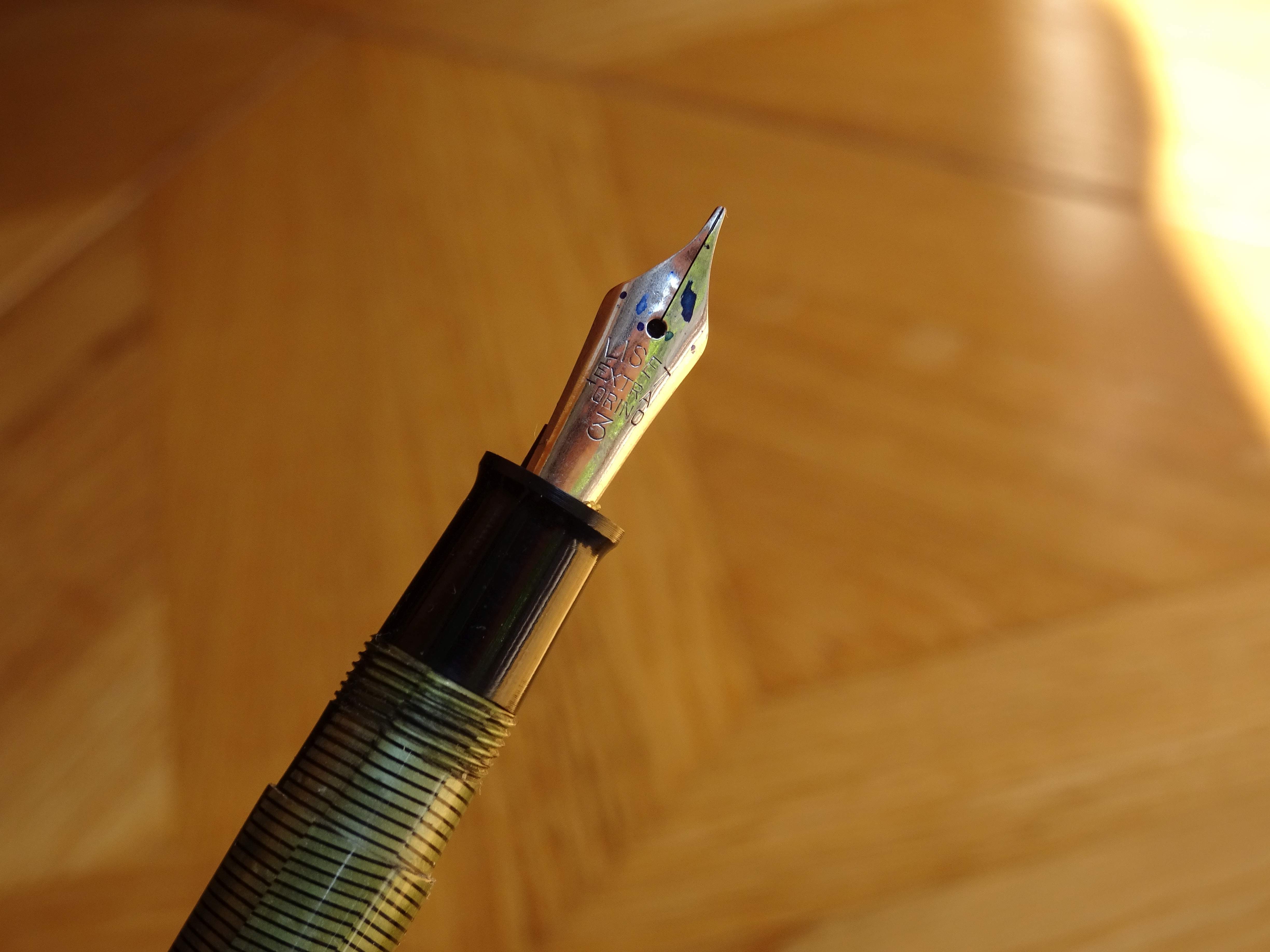 Permettetemi di aggiungere una 'sospetta cugina' di questa ultima anellata verde; in realtà sono tutte figlie e figliastre della classica Vacumatic se non la prima, la più famosa ad 'anellarsi'. Il motivo sembra lo stesso ma in verticale è una Stilnova con il suo pennino in oro.