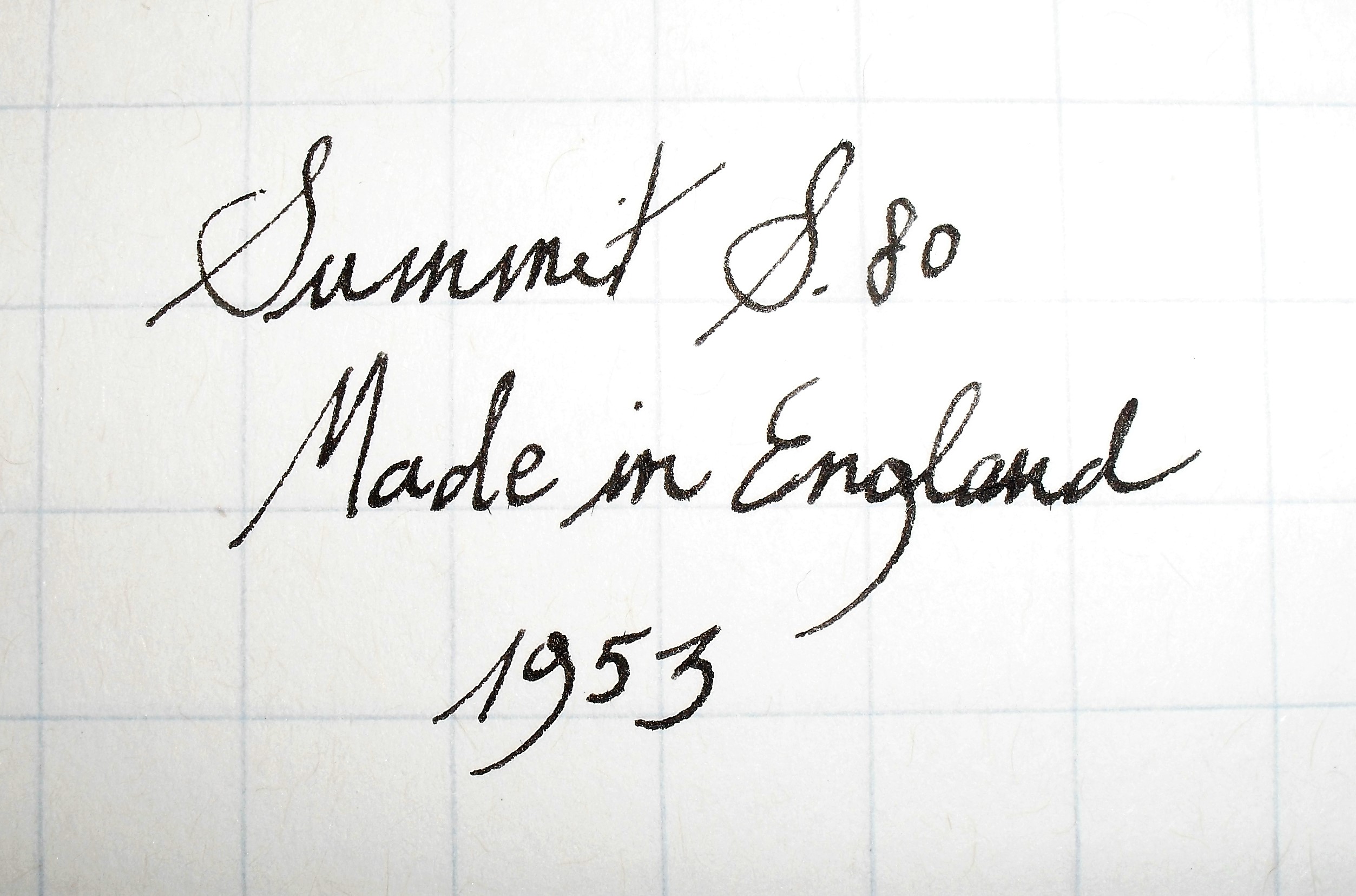 E’ la vigilia di una decisione drastica in casa Summit: quella di chiudere con un’avventura imprenditoriale di successo, cominciata in un seminterrato di Liverpool nel 1898. La penna a sfera usa e getta comincia ad affermarsi ed in casa Lang – Summit non si desidera affrontare il nuovo mercato con sistematicità. Ma si crede ancora nel marchio, tanto da proporre un modello nuovo: la S. 80, una piccola stilografica da tasca in celluloide, con pennino d’oro a 14 carati ed alimentazione a leva laterale. Un prodotto curioso, ma non unico nel suo genere in quel periodo.