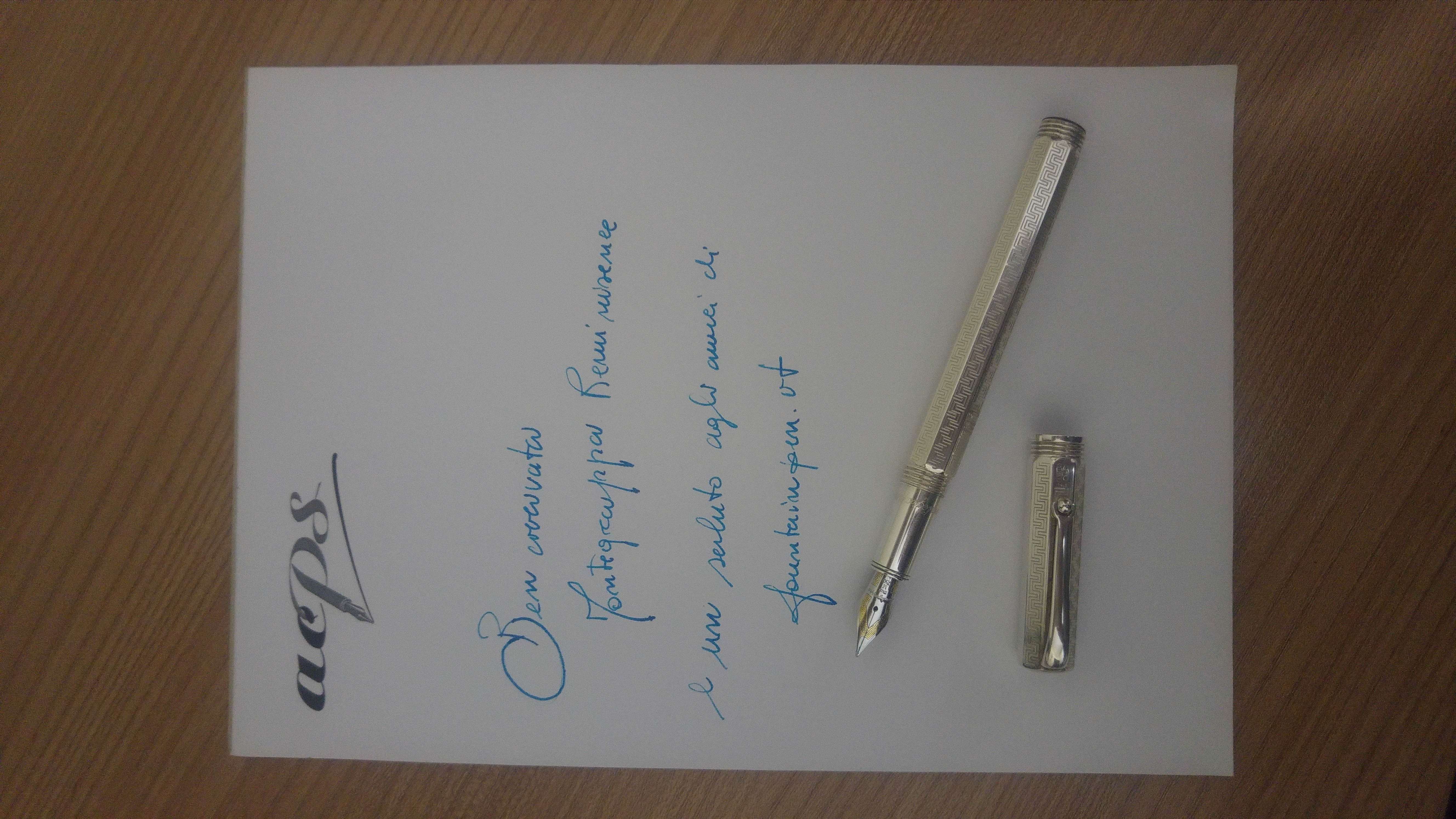 La prima è la classica Aurora Auretta anni 80. È leggerissima, più di una Preppy per capirci, spero che duri, perché ci si scrive bene ma sembra di non averla. Scorrevole, con un tratto fine, ma non giapponese, senza variazioni se si esercita una pressione. L’ho caricata con una cartuccia Parker, a cui ho allargato leggermente il foro con l’avvitatore e spuntato becco e coda con un taglierino. L’incastro è perfetto, non forza, ma non si muove di un mm.