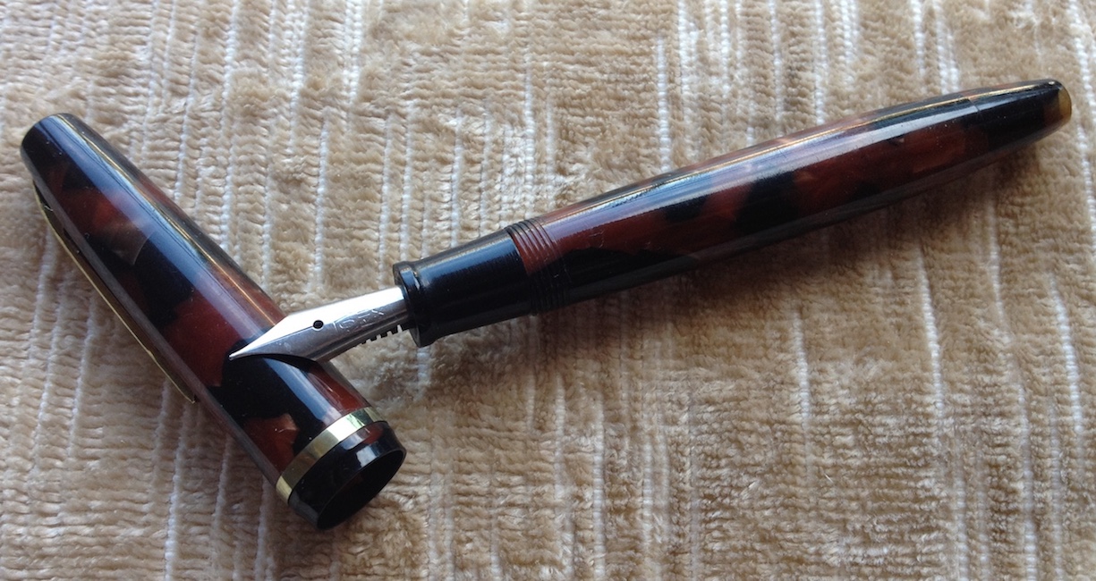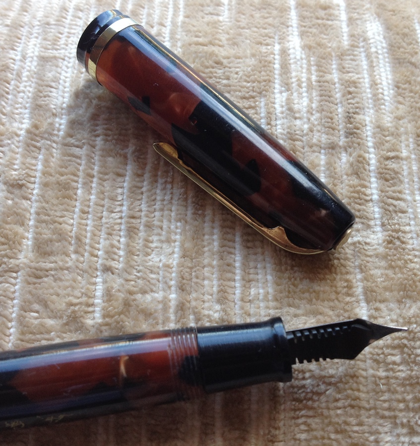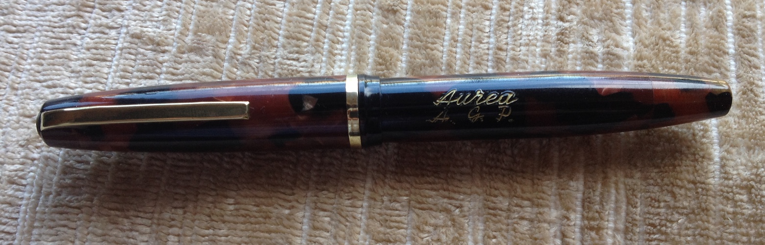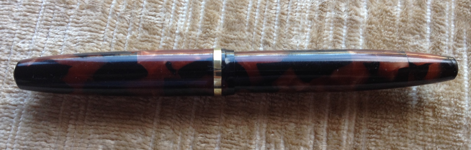 Come vedete, al di là dei segni dovuti all'avvitamento " sclerotico" del cappuccio, il pennino non è il suo, infatti ne sto cercando uno. Le componenti metalliche sono più che decenti e credo che la penna sia stata prodotta a cavallo tra il 1940 ed il primo dopoguerra. Al di là del marchio raro, mi è piaciuta subito per il colore ambra scuro della celluloide.