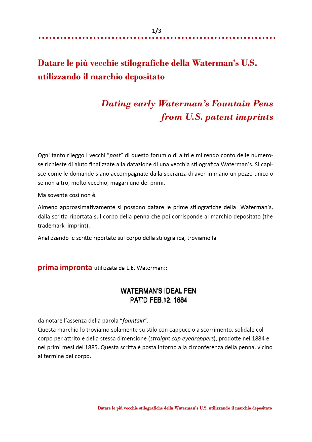 Ogni tanto rileggo I vecchi “post” di questo forum o di altri e mi rendo conto delle numerose richieste di aiuto finalizzate alla datazione di una vecchia stilografica Waterman’s. Si capisce come le domande siano accompagnate dalla speranza di aver in mano un pezzo unico o se non altro, molto vecchio, magari uno dei primi.