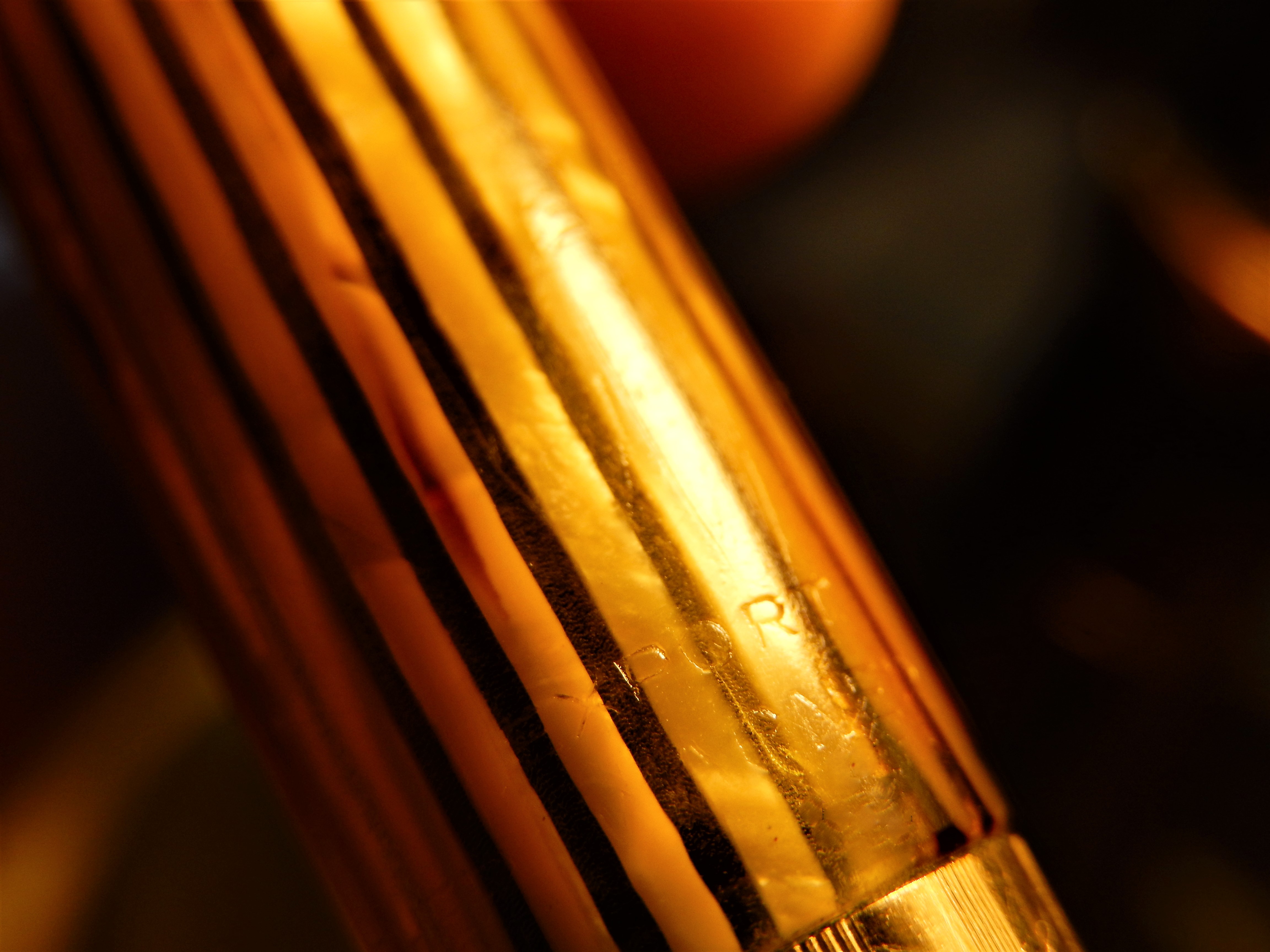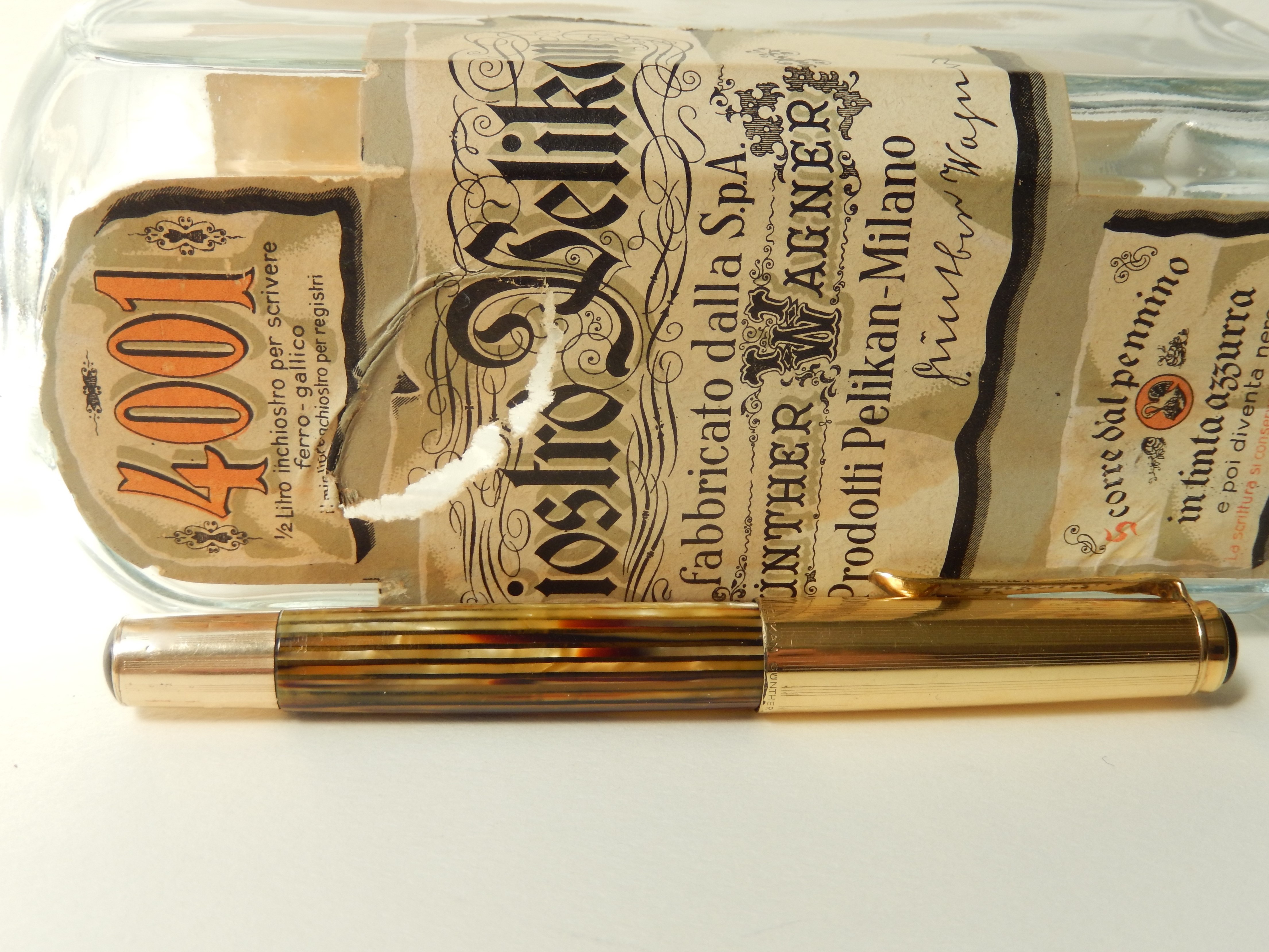Sul labbro del cappuccio si legge " Pelikan Doublé L Pelikan Gunther Wagner", dove doublé sta ad indicare una apposizione di oro 585 su una base di ottone, mentre credo che la L stia per "Laminat", con una lavorazione che doveva garantire un qualcosa di molto più duraturo rispetto ad una semplice doratura . Sul corpo, di una bellissima trasparenza, troviamo la scritta " Gunther Wagner" sovrastata dall'indicazione "Export"