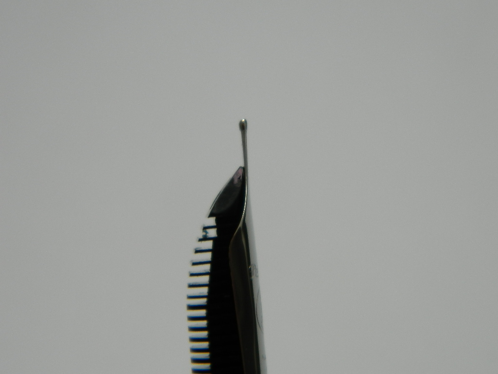 purtroppo non sono riuscito a fare foto, ma di profilo il pennino non è diritto, la punta va all'insù.