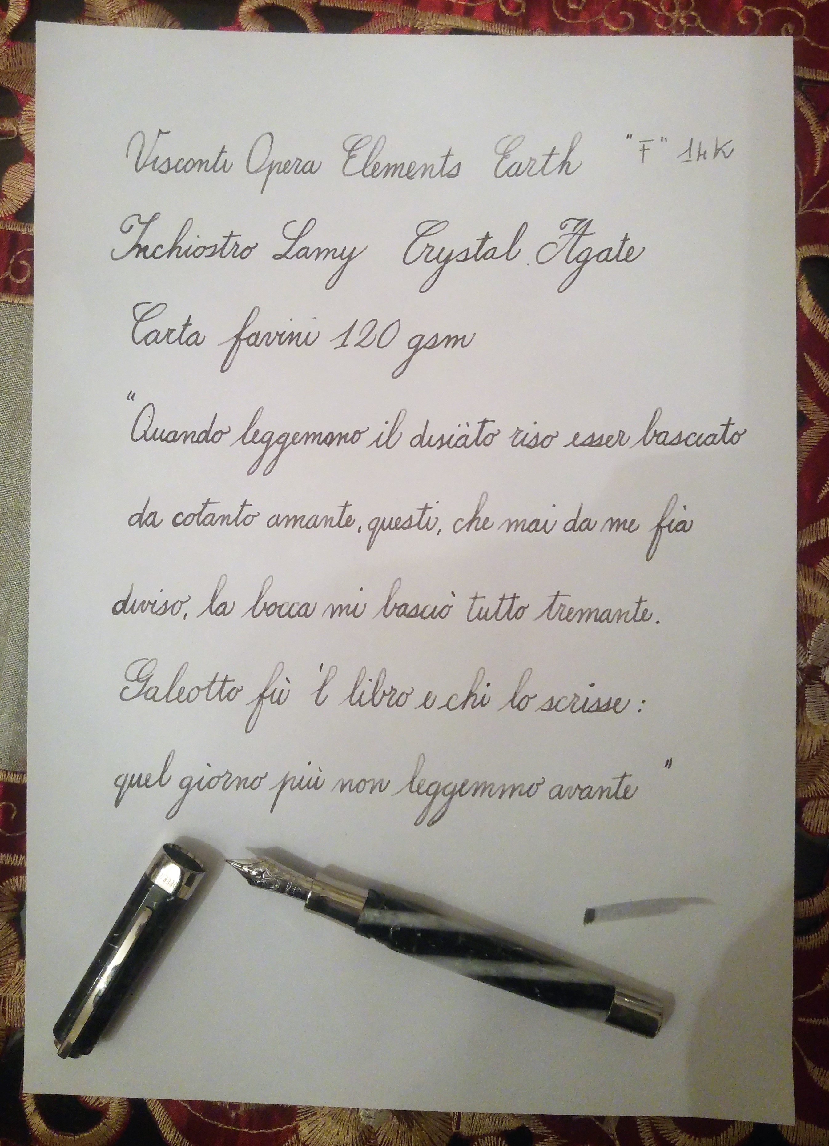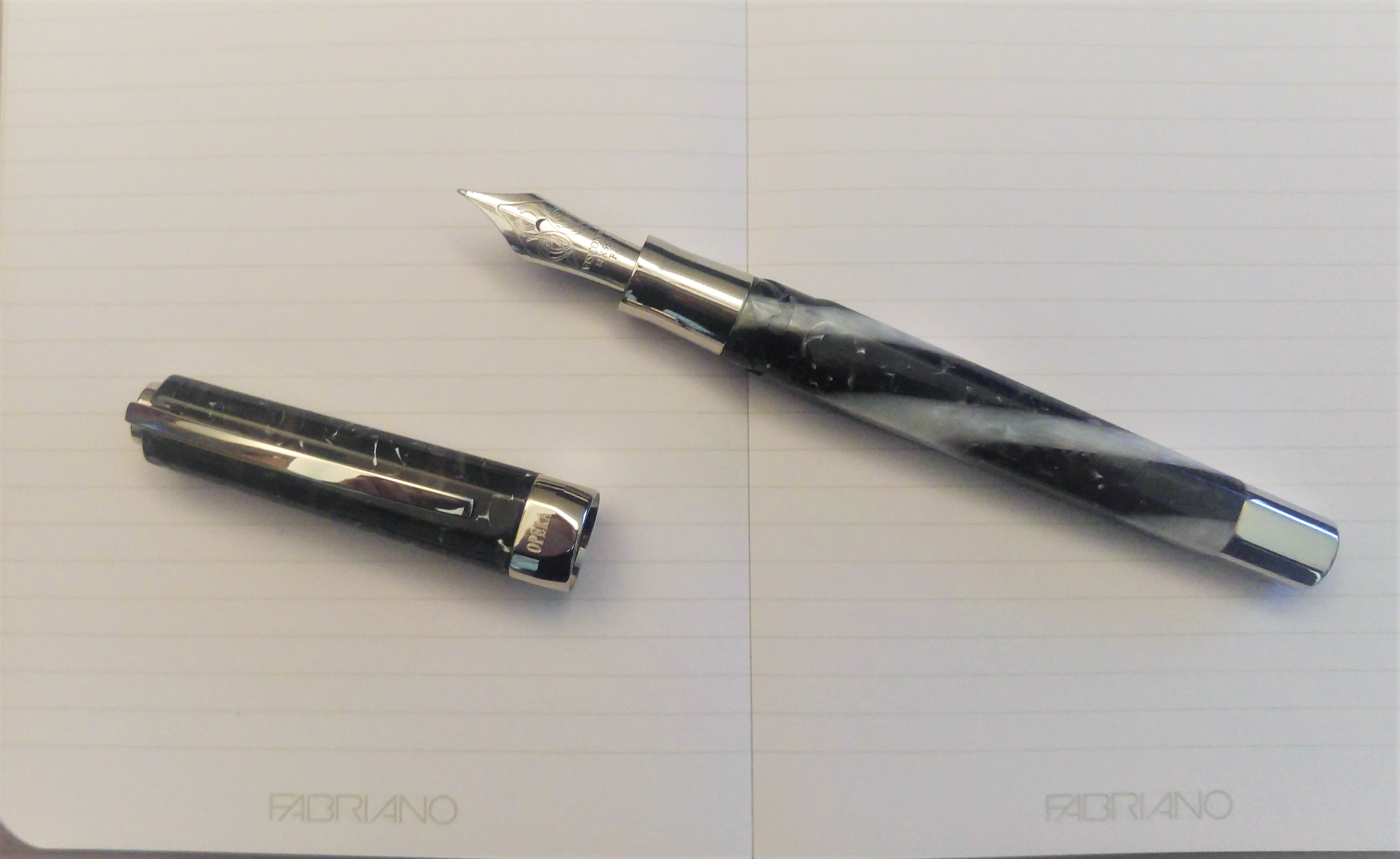 Trovo la penna oltre che bella e solida, il cappuccio usa il sistema a baionetta che consente di mantenere le facce tra cappuccio e fusto sempre allineato, la clip è caricata a molla e sul cappuccio ha il sistema Visconti My Pen su cui ho messo le mie iniziali. Il sistema di caricamento è a cartuccia/converter con montaggio a vite, semplice economico e funzionale. La sezione metallica è a mio parere il solo neo di questa penna, non tanto per una questione estetica quanto funzionale, benché la penna sia molto comoda e ben bilanciata, diventa un po' scomoda in lunghe sessioni di scrittura per chi, come me, ha la tendenza a sudare sempre un po' le mani. Il pennino è un #6 14K di misura F nel mio esemplare; io lo trovo più piacevole del dreamtouch al palladio, è più scorrevole, è bello morbido, permette un po' di variazione del tratto (ma su questo il dreamtouch non è da meno), ha un flusso più controllato ed un tratto più “giusto”, l’F della Opera Elements è più sottile del EF del 23K al Palladio che ho sulla Divina.
