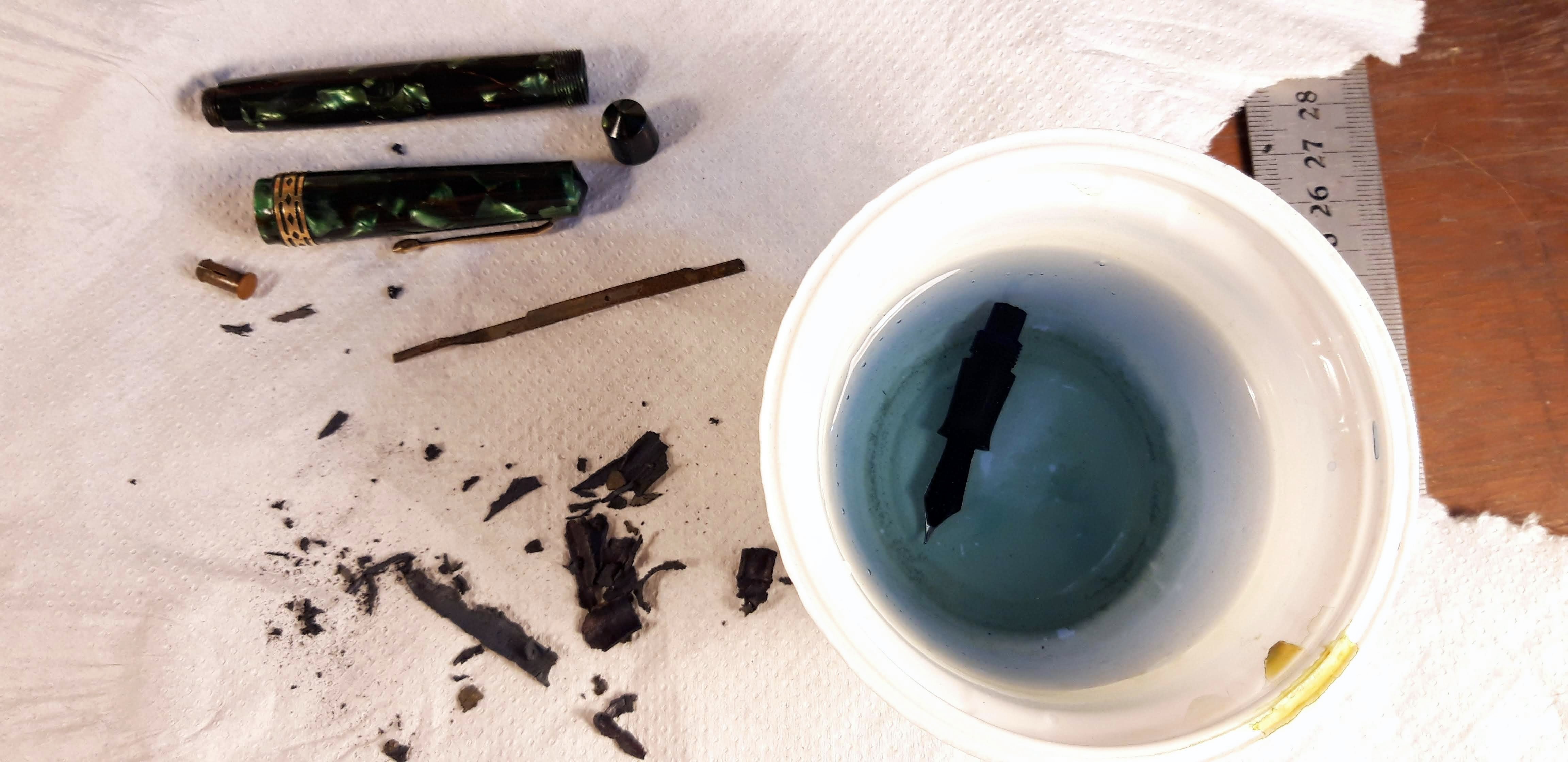 nel frattempo, dopo due giorni a mollo in acqua, sono riuscito a separare l'alimentatore e il pennino senza danni.