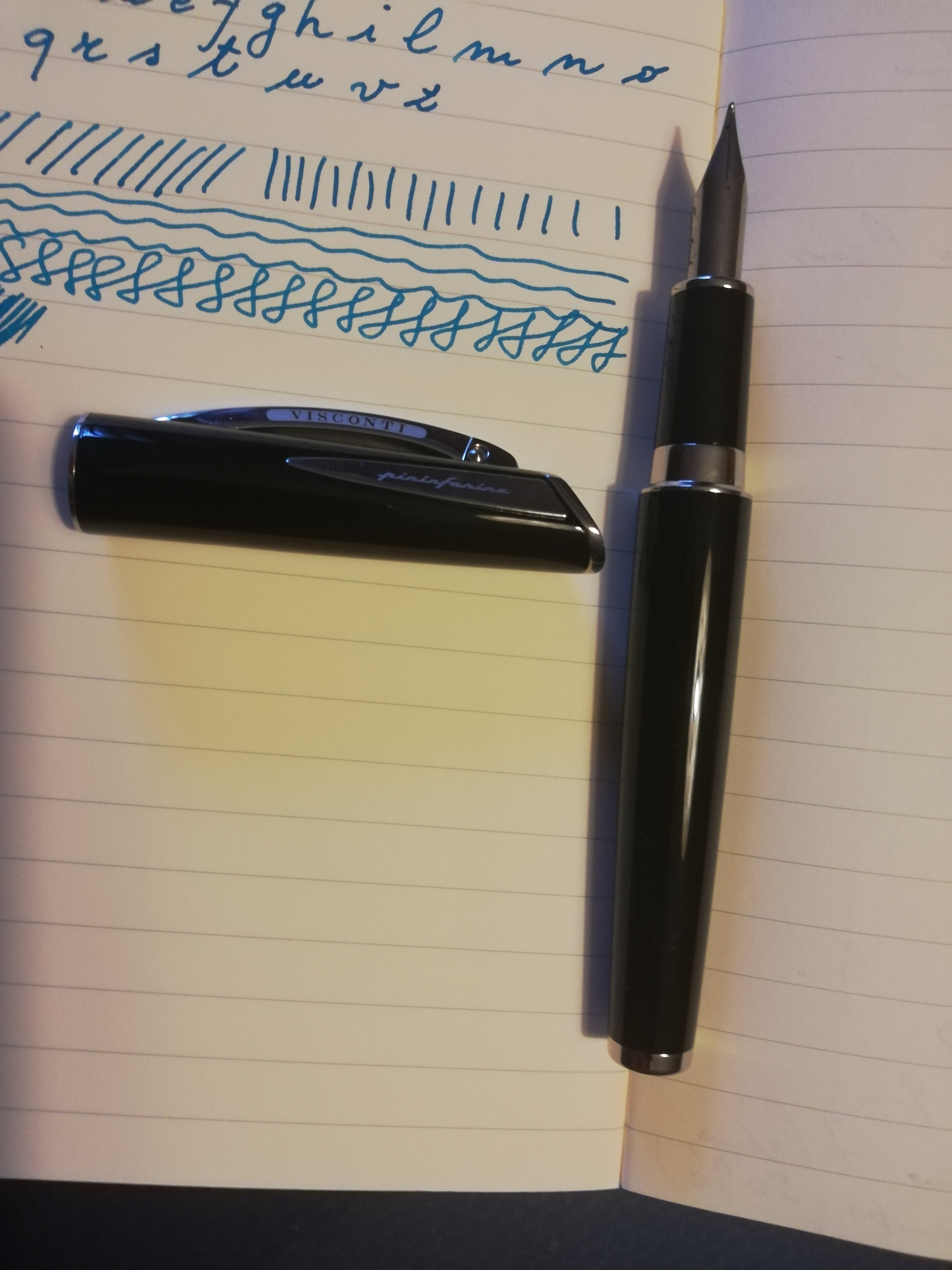 E' una penna dalle dimensioni tradizionali (vedi foto in compagnia). L'aspetto generale è piuttosto massiccio, ma il bilanciamento è ottimo e si scrive tranquillamente con il cappuccio innestato per lunghe sessioni. La chiusura è a calamita. Il caricamento è a converter (incluso). L'estetica è a discrezione, però la scorrevolezza di scrittura è eccellente. E' questo il punto di forza. L'aspetto estetico molto "techno" è di gusto personale (a mer personalmente piace).