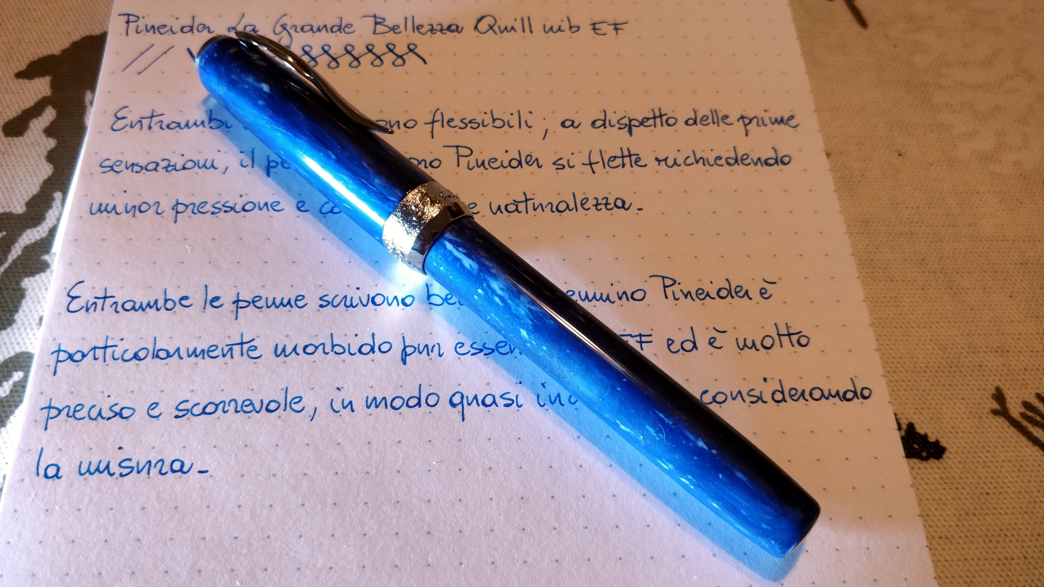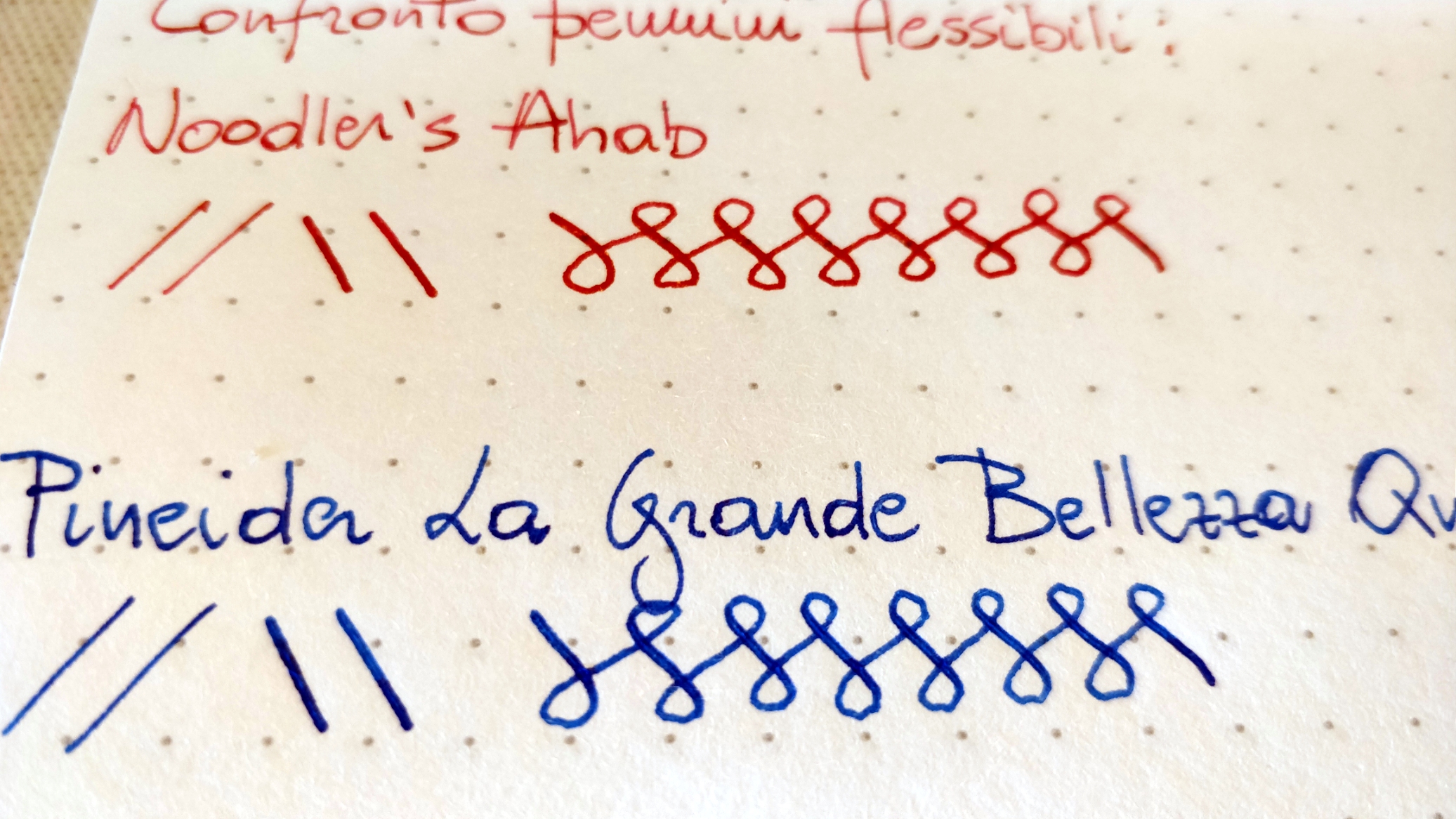 Per rendervi l'idea, è molto simile a quella di una Noodler's Ahab con a favore una maggiore reattività di conduzione e con una minor necessità di far pressione per ottenere l'allargamento del tratto.