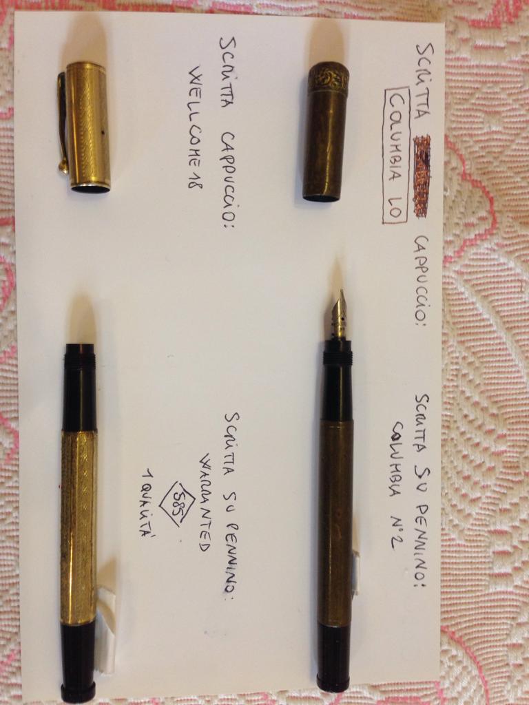 -penna con cappuccio provvisto di clip: scritta "wellcome 18" sulla parte inferiore del cappuccio e scritta "warranted 585 1qualità" sul pennino.