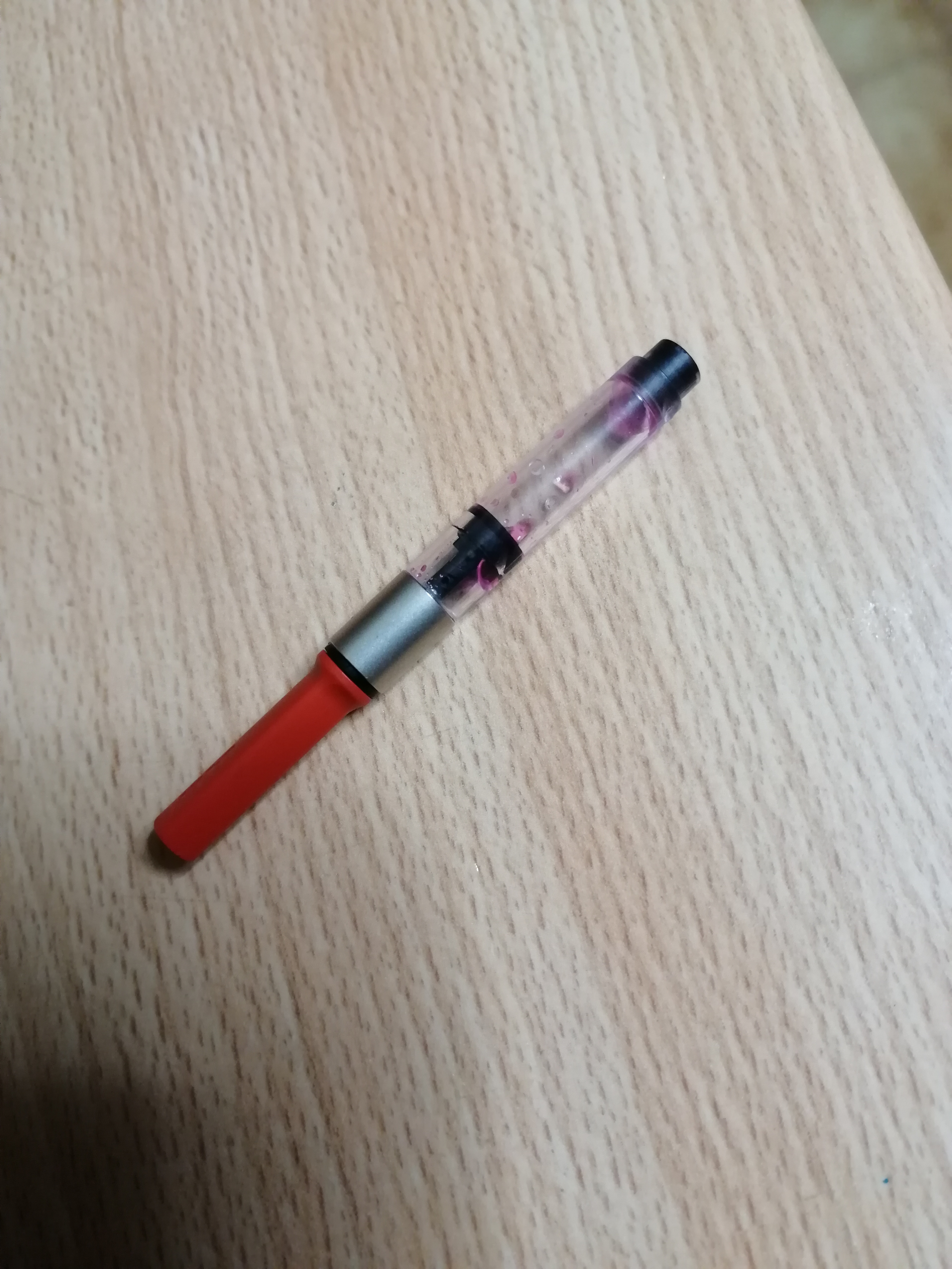 Avevo delle penne ferme che non scrivevano e ho deciso di darle una lavata ma spero di non aver fatto danni con il converter. Invece di lasciarlo inserito nel gruppo scrittura l'ho staccato e passato sotto l'acqua ma si é formata una goccia dietro al pistone (spero che dalla foto si capisca meglio). L'ho per caso rovinato o si asciuga? Non saprei nemmeno dove iniziare se dovessi smontarlo.