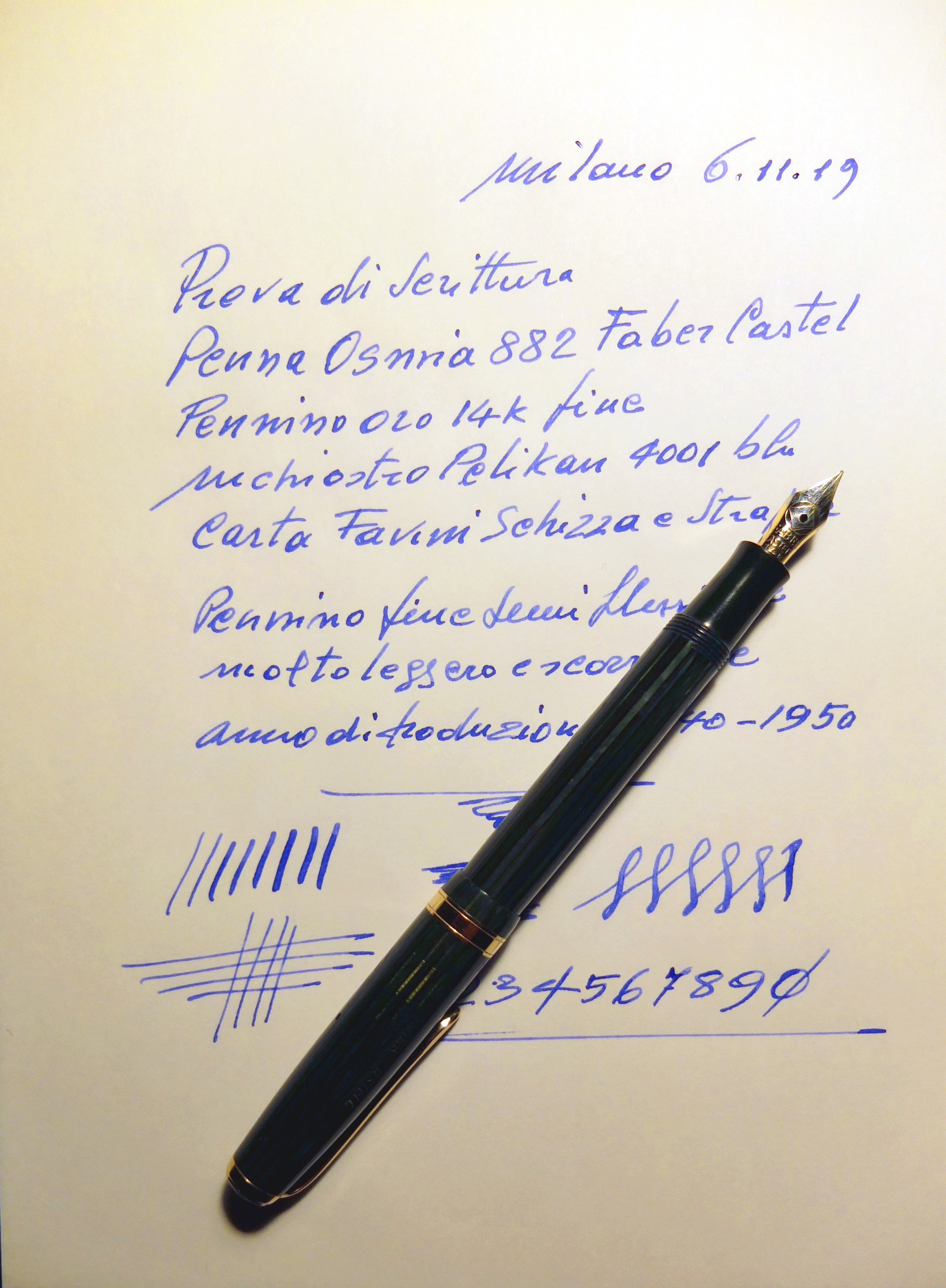 La penna ha un eccellente sistema di riempimento del pistone. Non mostrato nelle foto, ma è dello stesso colore verde della penna. Semplice ma potente come il riempitivo a pistone Pelikan, ma dotato di una filettatura in contrapposizione all'attrito. Dove questa 882 dà a Pelikan e Montblanc il distacco, per quello che costano, è la scrittura: il suo pennino è superbo. Osmia era famosa per i suoi pennini. All'epoca è molto più grande della maggior parte dei suoi concorrenti, sembra quasi che non appartenga a questa penna, è così grande. Pennino F ultra affilato semi flessibile. Sembra giusto e fa una scrittura straordinaria. Può facilmente flettere con una leggera pressione e i denti si divideranno fino a 2 mm. Anche se è F, non è graffiante, solo se premuto molto forte. Ma è un pennino spesso, quindi a differenza di molti pennini flessibili che potrebbero piegarsi facilmente quando vengono premuti, questo si ritrae sempre nella sua posizione originale.