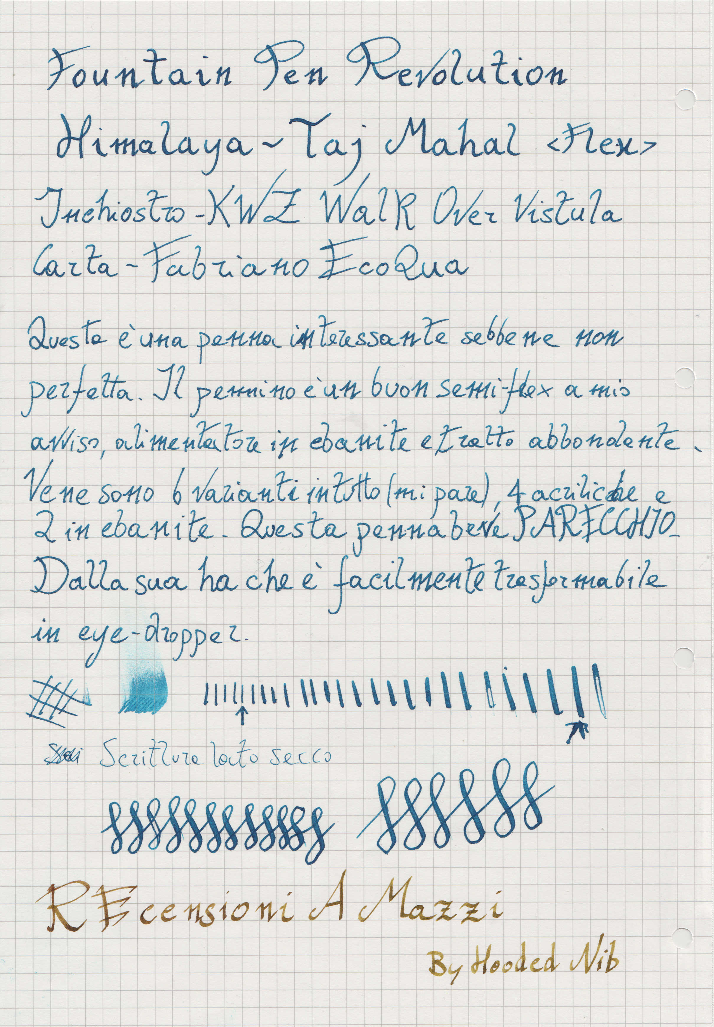 Salve a tutti e finalmente vi scrivo di questa penna che ho da un pochino dopo averla provata, rimaneggiata, pulita, smontata e rimontata, cambiato colori ed essermela rigirata per un po, una Fountain Pen Revolution modello Himalaya, variante Taj Mahal (si riferisce al colore della stessa) con pennino "flex".