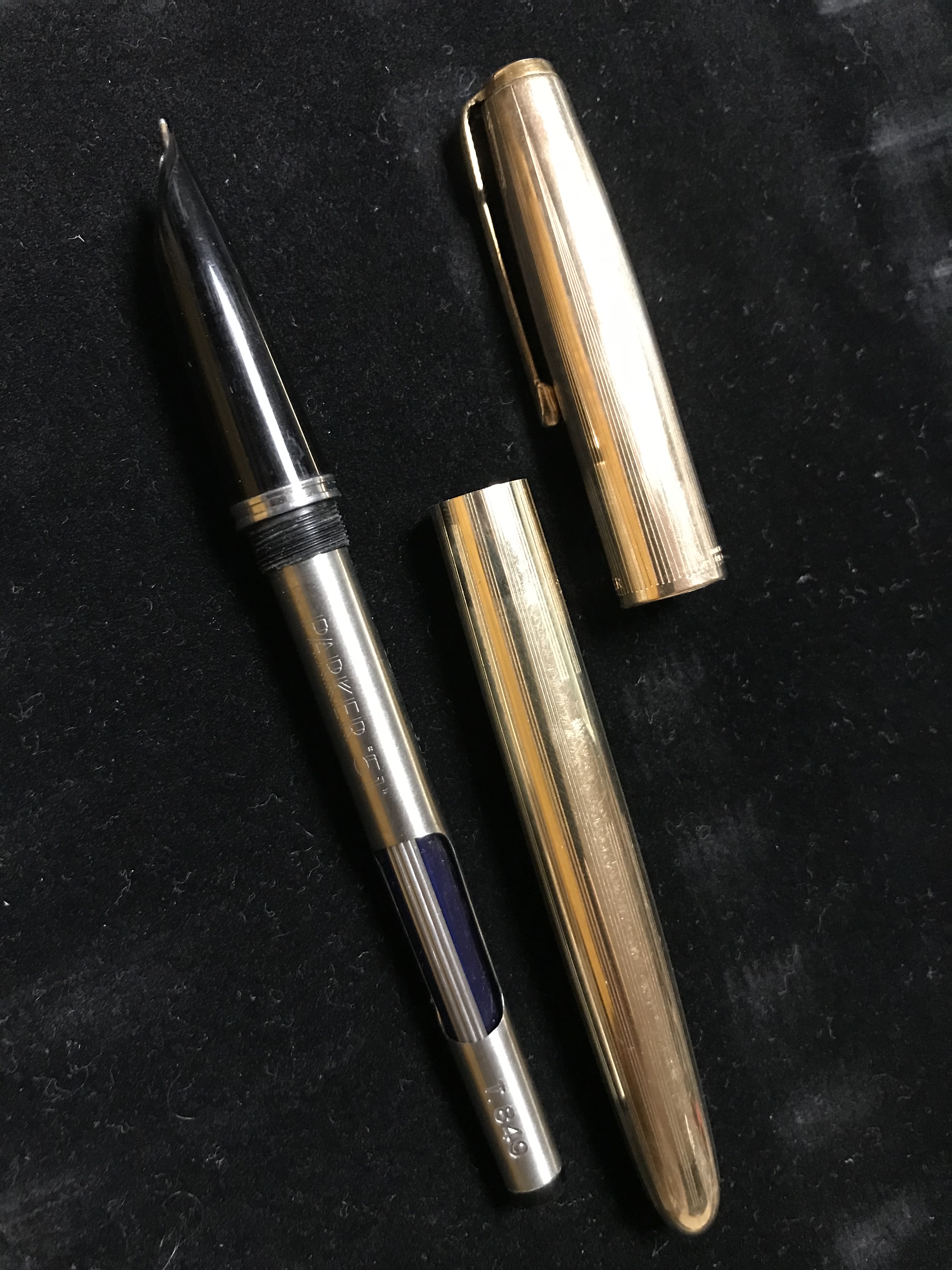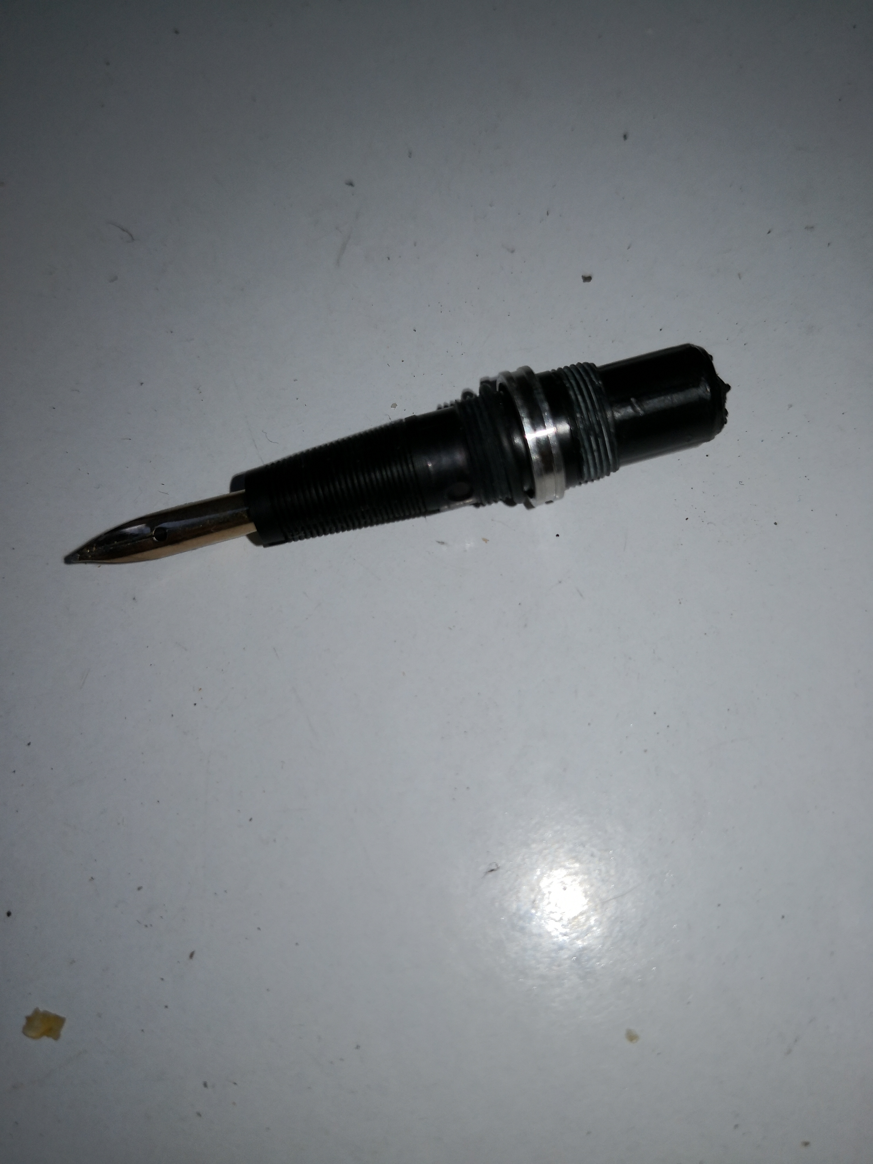 Quel mozzicone a me sembra proprio quello di una 51. Ma manca la sezione (ovvero la copertura) e manca tutto l'aerometrico, mentre noto uno strano coso nero non identificato su didietro. Una cosa è certa: non può essersi trattato di una penna con caricamento vacumatic: mancherebbero un po' di pezzi alla parte posteriore del corpo penna e l'inchiostro a contatto con il metallo è una cosa che non va tanto bene.