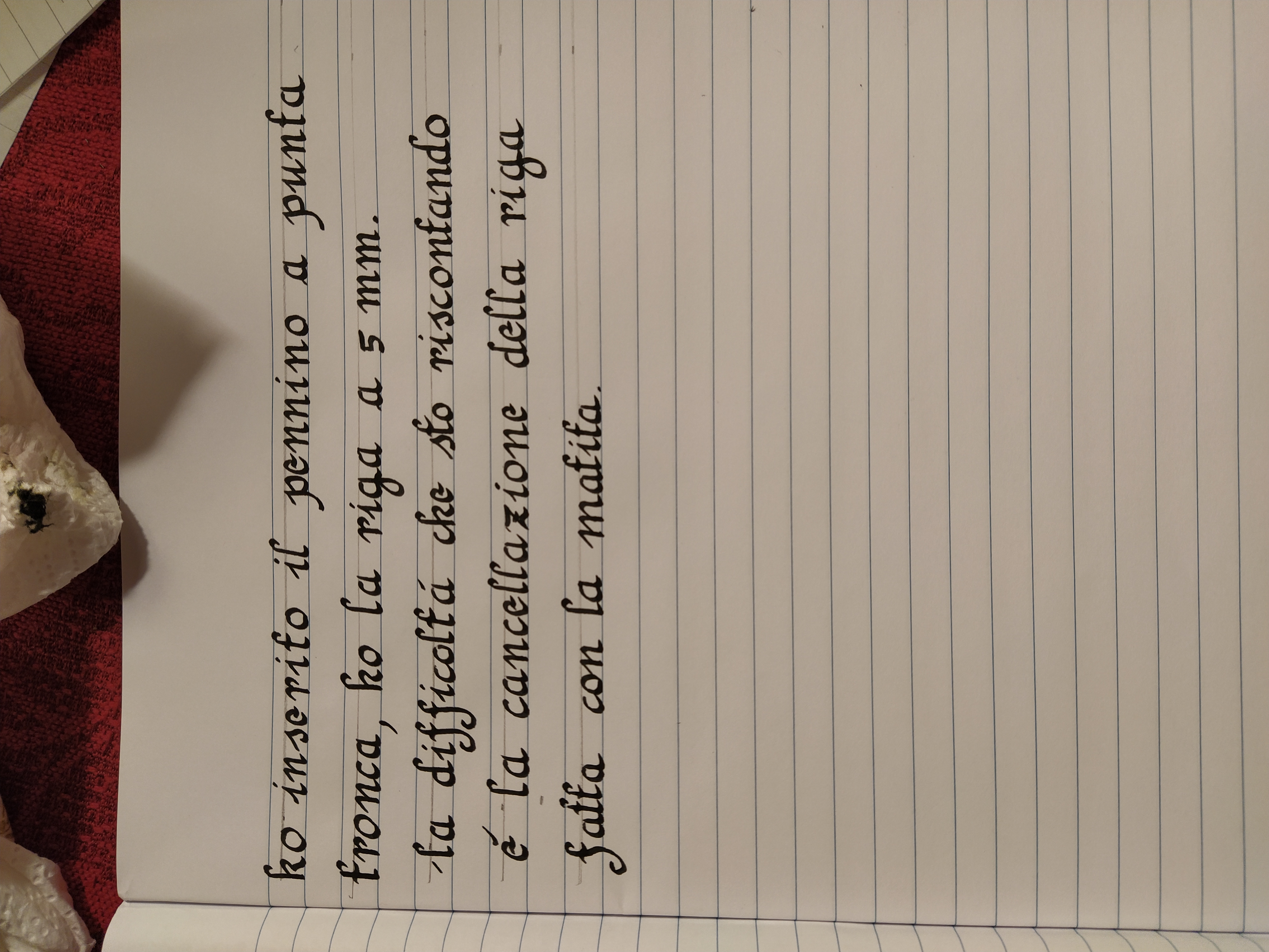 Falsariga: oltre a tracciare a matita (in questo caso puoi poi cancellare con la gomma purché l'inchiostro sia sicuramente asciutto; a volte ci vuole un giorno intero), se usi fogli singoli puoi comodamente mettere sotto al foglio di scrittura una falsariga che generi da internet (puoi cercare ad esempio "ruling sheet generator" e dovresti trovare subito un generatore di falsariga con possibilità di definire altezze, inclinazioni, interlinee, ecc.; .