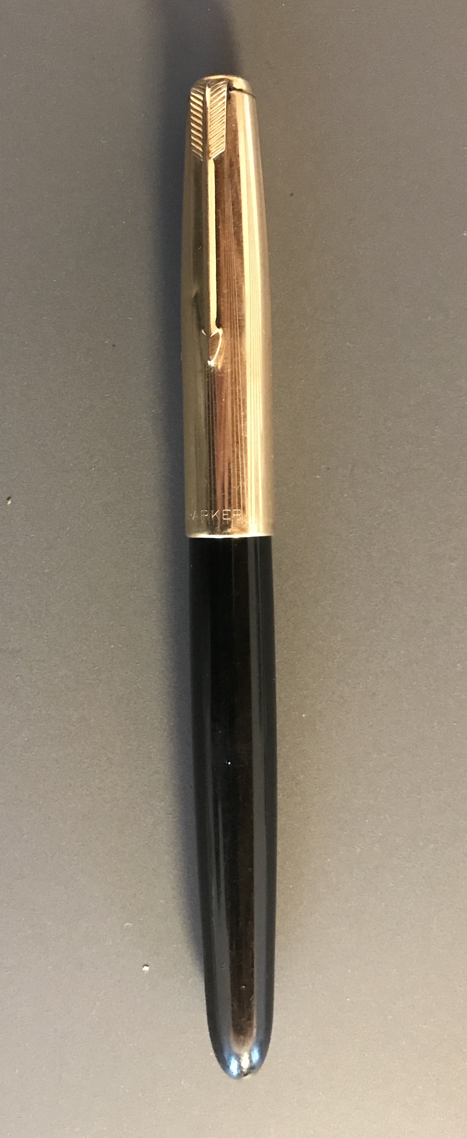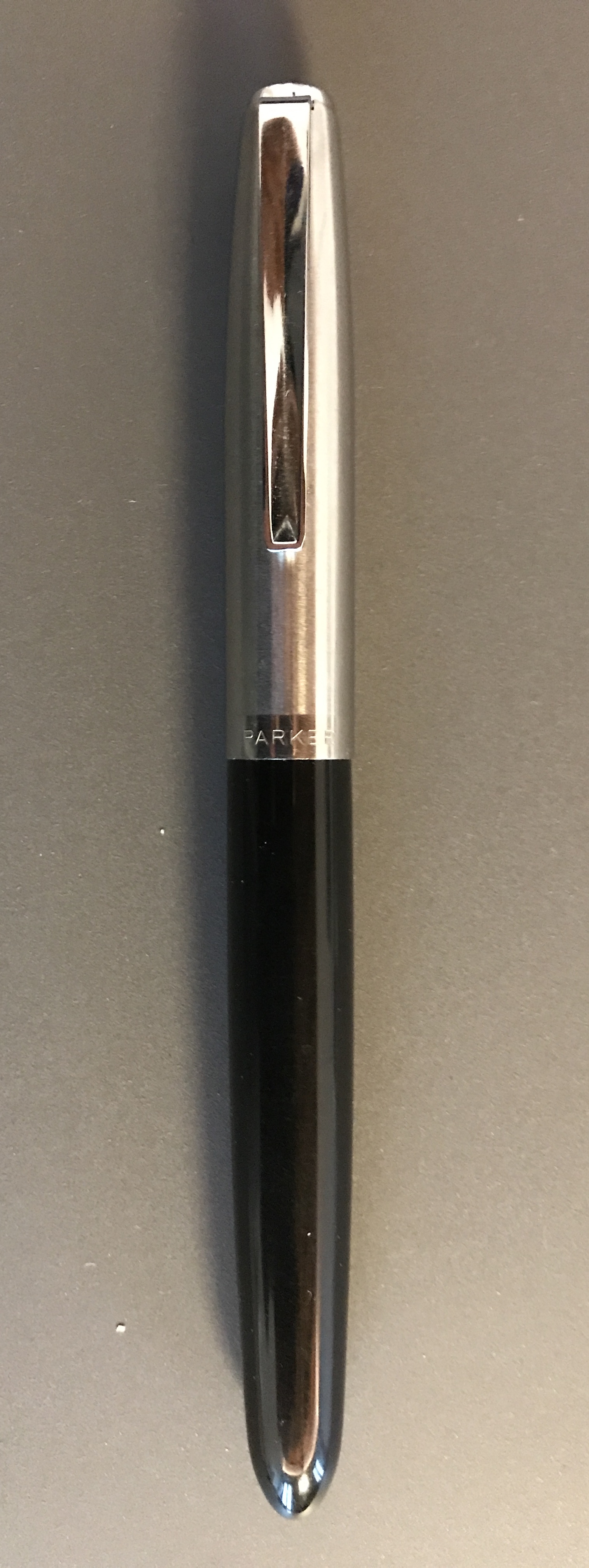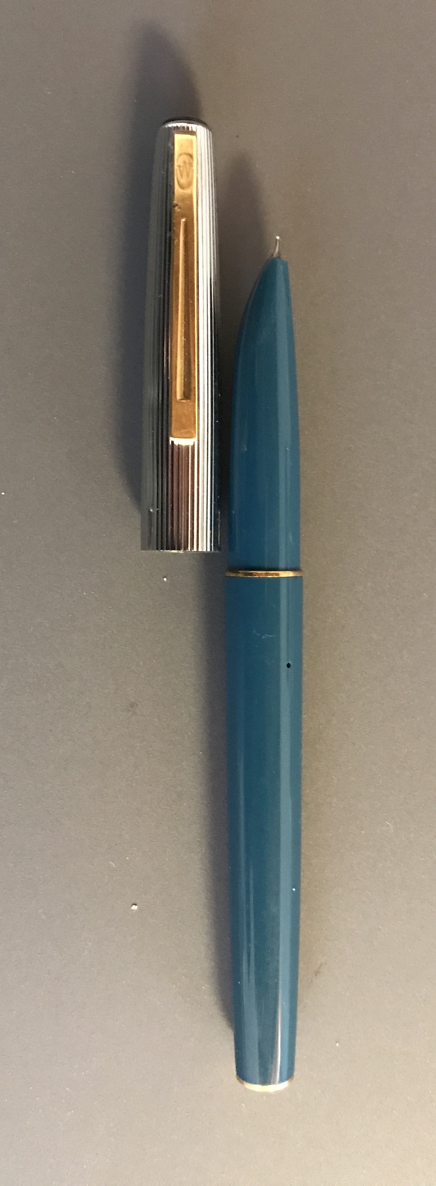 7) È su questa che ho il mio primo vero quesito: che roba è? Propendo per una scolastica imitazione Parker. Il fermaglio è a forma di freccia ben imitato ma il cappuccio non porta inciso il nome Parker. Potrebbe essere invece un cappuccio Parker messo su una penna scolastica a siringa e quindi una franken o una autentica scolastica economia a siringa tutta originale?