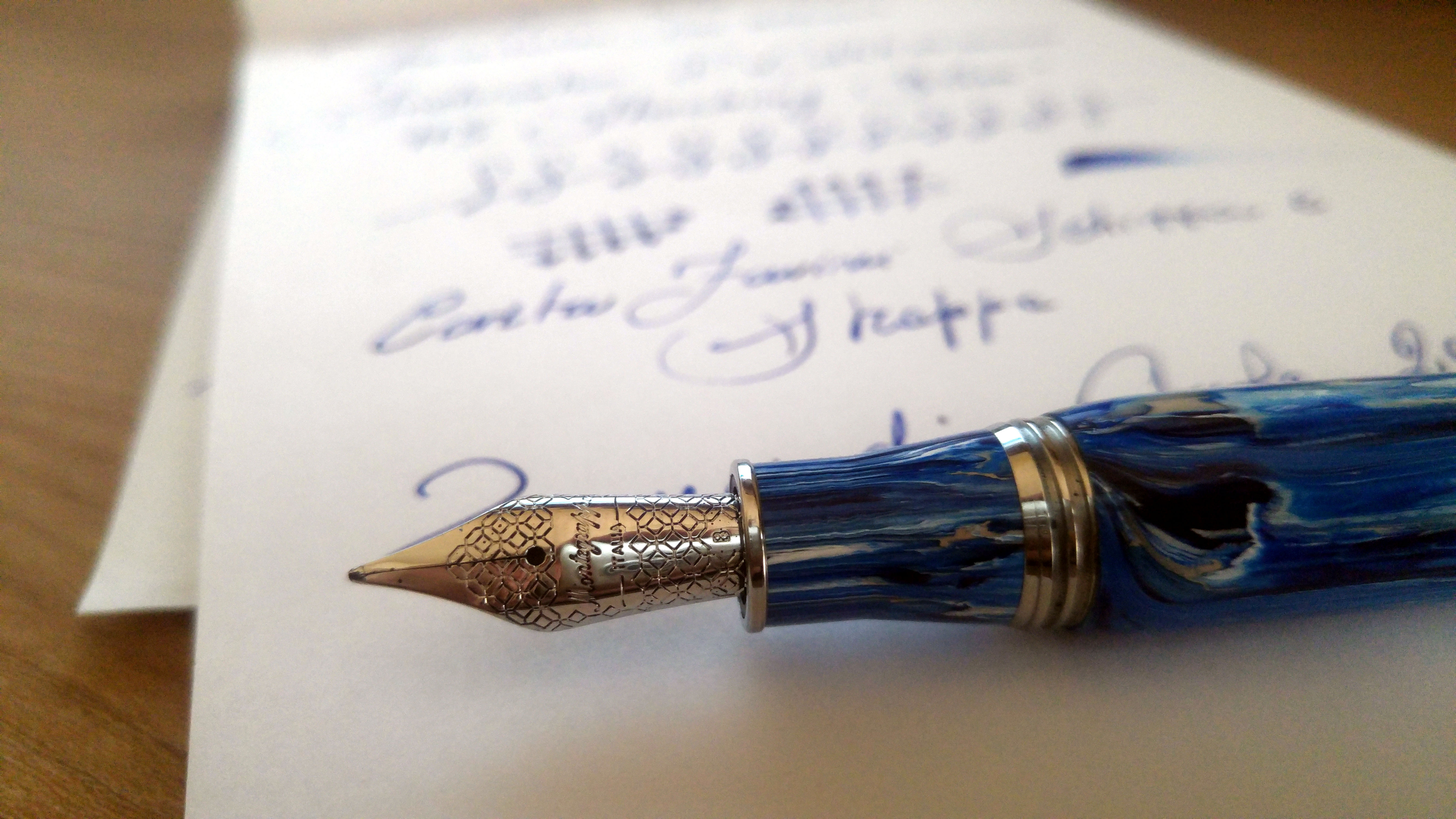 Il pennino in acciaio è un nr. 6 con una bella lavorazione, mentre l'alimentatore è in plastica, ma la cosa davvero piacevole è che la penna scrive davvero bene, e ha scritto appena tirata fuori dalla scatola senza neanche il bisogno di una lavata. Il tratto ha un flusso ben regolato ed è più sul versante orientale che occidentale come larghezza del tratto. Io ho preso un pennino B ma scrive più come un M. Insomma oltre al particolare materiale, che può non piacere a tutti, la penna è secondo me ben realizzata e, sopratutto, scrive bene. Il costo forse è un po' elevato ma lo sappiamo gli oggetti di casa Montegrappa si fanno pagare!