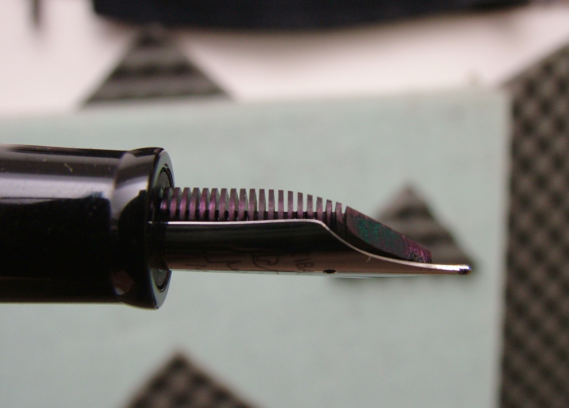 Io non avevo messo in conto di prendere questa penna. L'avevo vista su Stilograficamente ed avevo pensato "si dai, bella penna ma posso farne a meno" poi facendo un giro nel negozio della città cercando un'altra penna mi si è presentata di fronte e ne son rimasto folgorato. Tra tutte le livree, quella che mi ha fatto sussultare è la bordeaux nero. Ogni tanto mi ritrovo a rigirare la penna tra le mani per ammirarne i colori... Come pennino c'era l'EF ed ho tenuto quello. L'ho caricata con il Pilot Iroshizuku Ajisai e noto che su carte meno nobili non ha nessun problema (gratta giusto un poco) mentre su carte lisce "nobili" tipo Rhodia ogni tanto mi perde qualche tratto (ho notato lo stesso comportamento sull'EF della Pelikan 200). Magari ha bisogno di un po' di rodaggio. Per il tratto mi sembra abbastanza simile al F dell'altra Tibaldi che possiedo (Perfecta, quella attuale però) e della Montegrappa Fortuna ed anzi analizzandoli per bene potrebbe essere anche un filino più largo. Per ora direi che le Tibaldi moderne meritano fiducia.