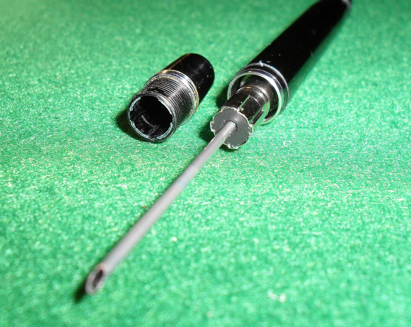 Interessante il fatto che l'ago rechi al suo interno un tubo in plastica, tagliato longitudinalmente.