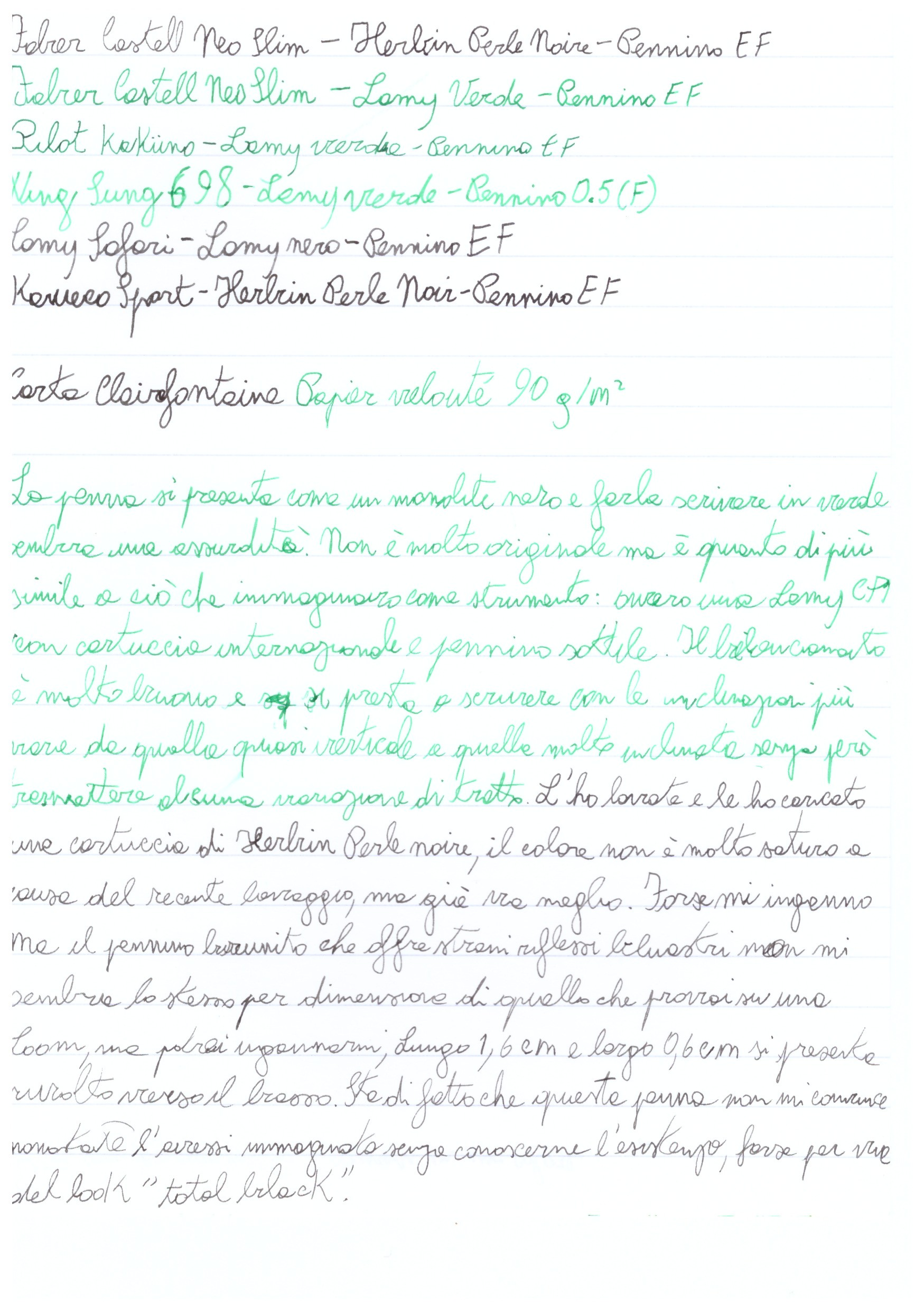 Ne ho buoni ricordi, ma la provai con Herbin Perle Noir e Lamy verde, nessuno di quei due inchiostri risultò problematico nei dieci giorni che rimase a casa. Se ti può consolare capita di rado anche con la Ambition caricata con Diamine Green/Black mentre non mi è mai capitato con il 4001 Royal Blue. Ma più che di false partenze si tratta di una secchezza del pennino dopo che l'ho tenuta per un po' in mano senza scrivere come capita mentre studio e basta poco per farla riprendere. Prova a prendere delle cartucce di altro inchiostro e vedi se dipende da quello, l'herbin non è affatto male, sta di fatto che non sono certo che il pennino sia lo stesso, mi sembrò più piccolo di quello classico delle Loom/Ambition/Ondoro/Emotion, ma si sa: il nero sfina e potrebbe essere solo un illusione.
