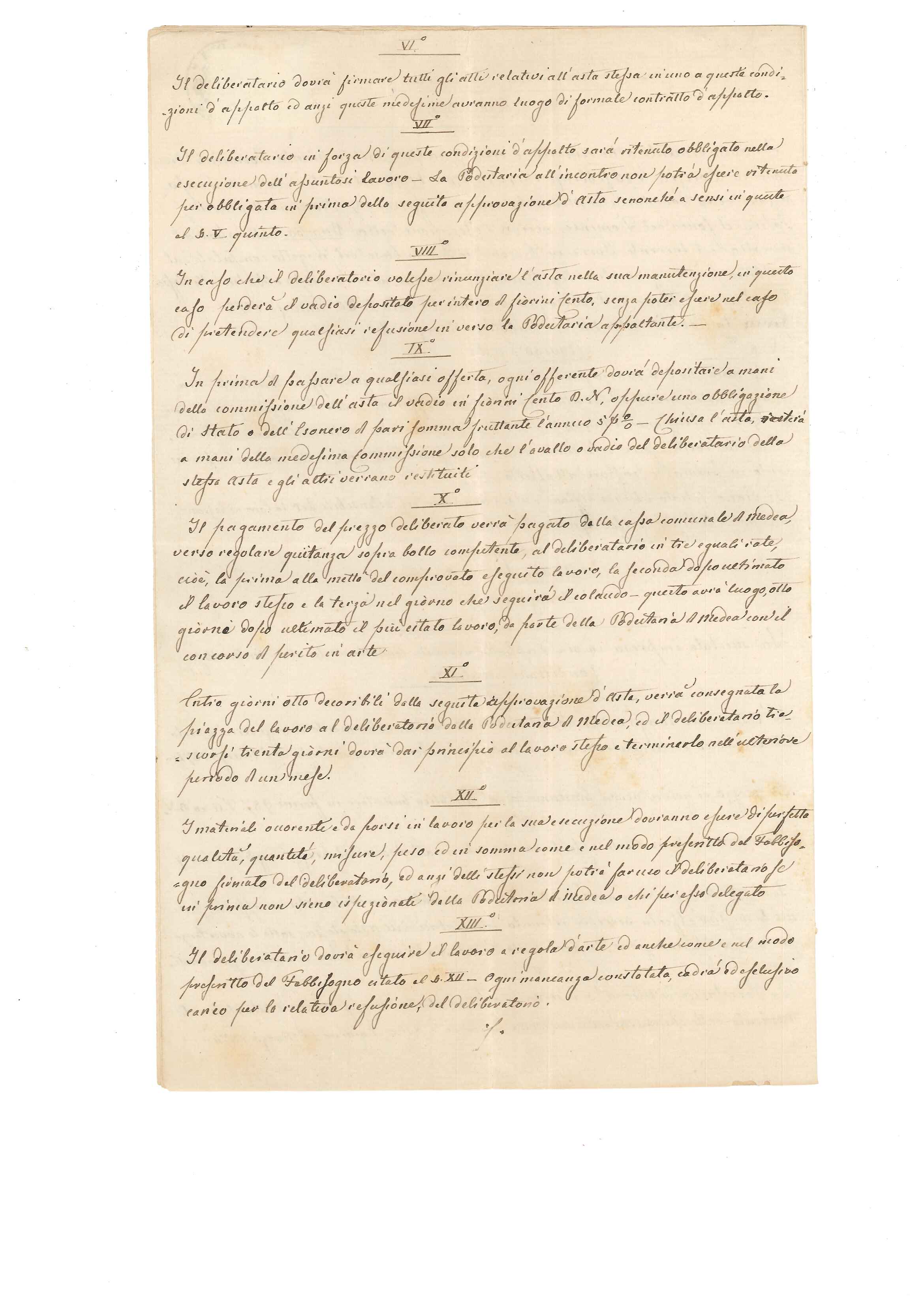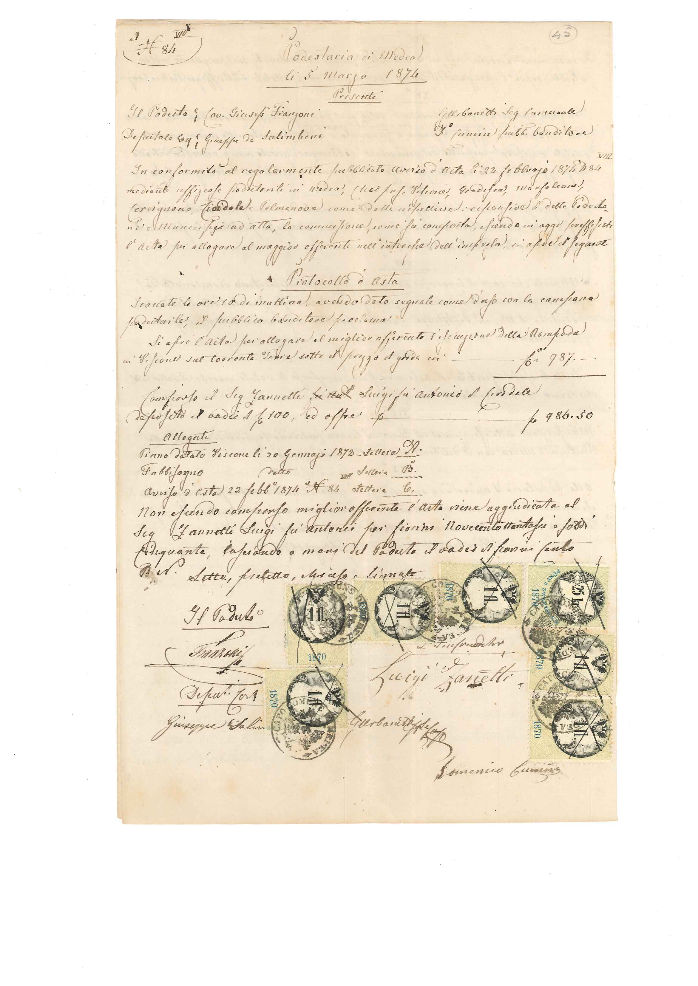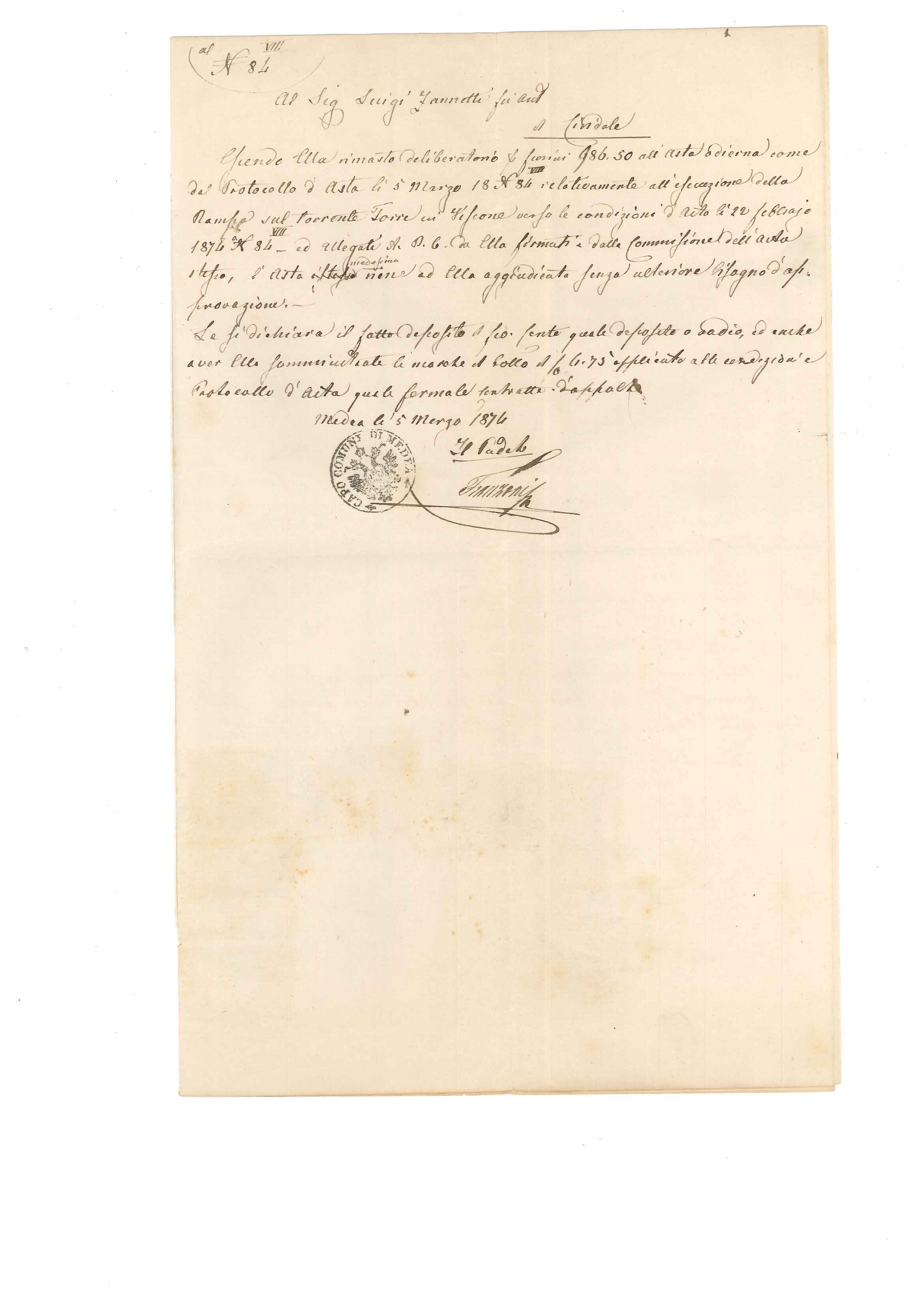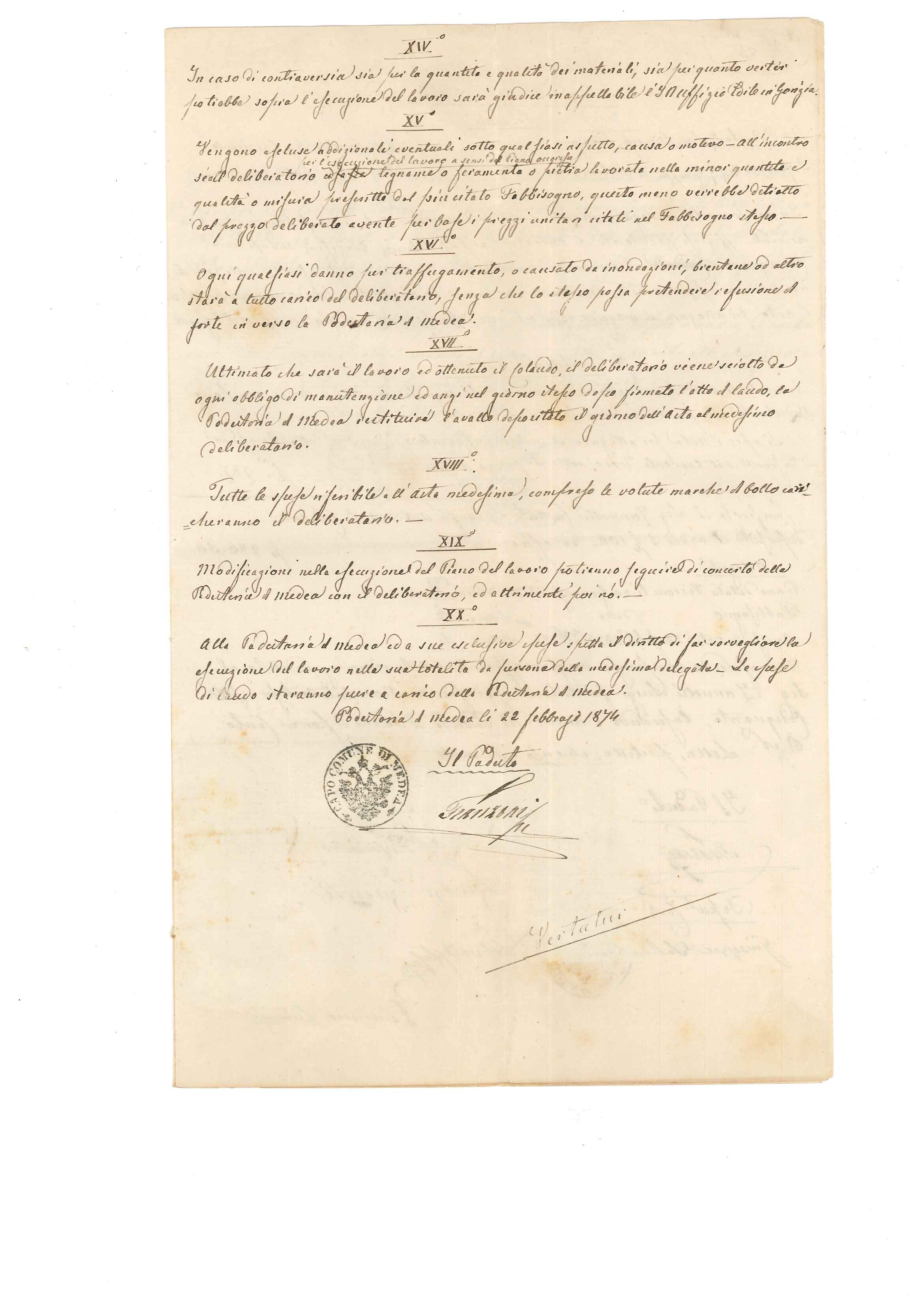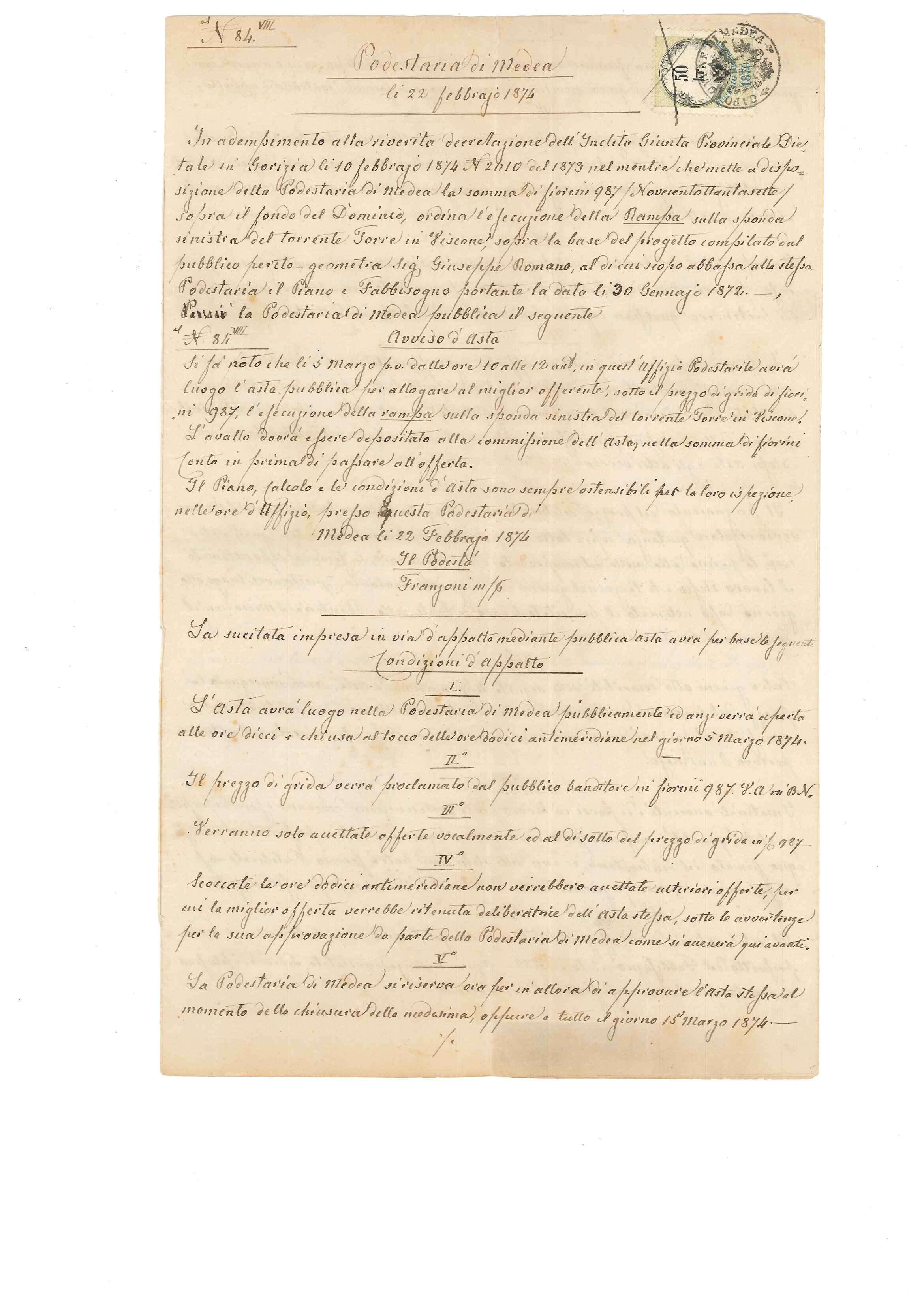 Buonasera a tutti, allego un documento riguardante un avviso d'asta per la sistemazione della sponda del torrente Torre nella "Podestaria" di Medea attualmente in provincia di Gorizia. L'atto è datato 22 febbraio 1874, è scritto in italiano però con bolli e marche Imperiali perché il territorio all'epoca apparteneva all'Impero Austriaco. La parte orientale del Friuli, coincidente pressapoco con le antiche contee di Gorizia e Gradisca, fu annesso all'Impero dopo il congresso di Vienna e al Regno d'Italia dopo la prima guerra mondiale. La parte occidentale,dopo il congresso,andò a costituire quello che fu il Regno Lombardo Veneto durato fino al 1866.