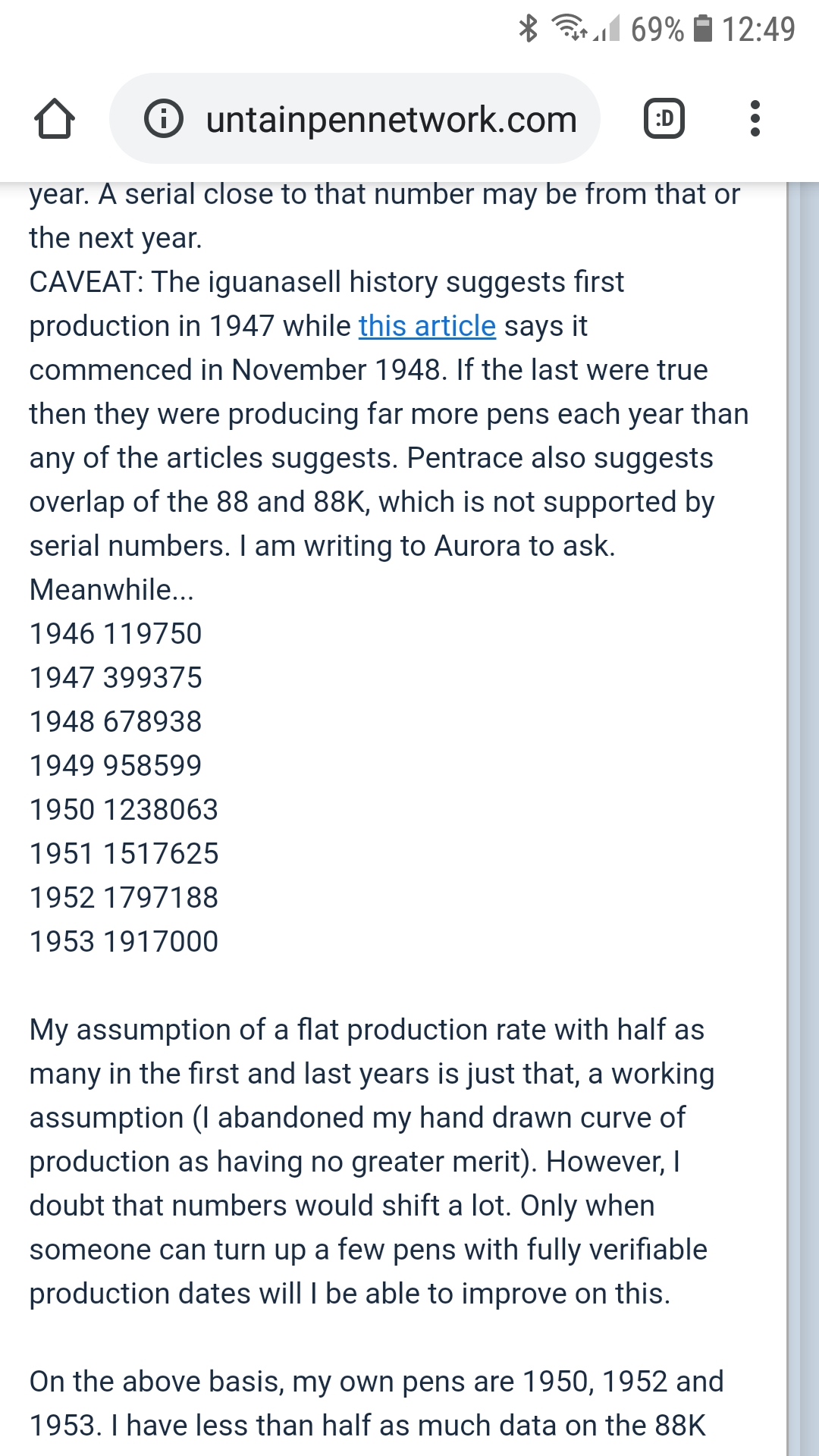 Nel farlo è ovviamente saltata fuori la problematica del possibile uso del numero seriale inciso sulle penne per poter datare le stesse. Purtroppo le uniche informazioni al riguardo, presenti in un articolo e dette provenire da non precisata fonte attendibile, dicono che la 88 raggiunse i circa 750000 esemplari venduti a inizio 1952 e il milione alla fine. Ma l'attendibilità di tutto questo è ovviamente molto questionabile.