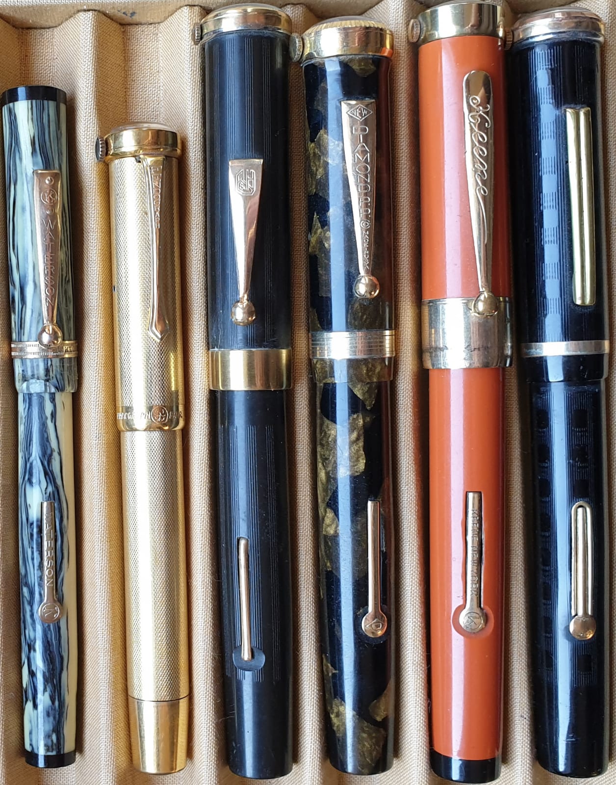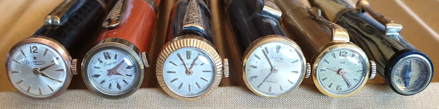 Scrivere con... un occhio all'ora ed uno al nord. Da sinistra, nella prima foto, (da destra nella seconda), con orologio: n.n. ebanite, Keene ebanite, Diamond celluloide, B&H ebanite, Fendograph ottone laminato oro; e, con bussola, Waterson celluloide.