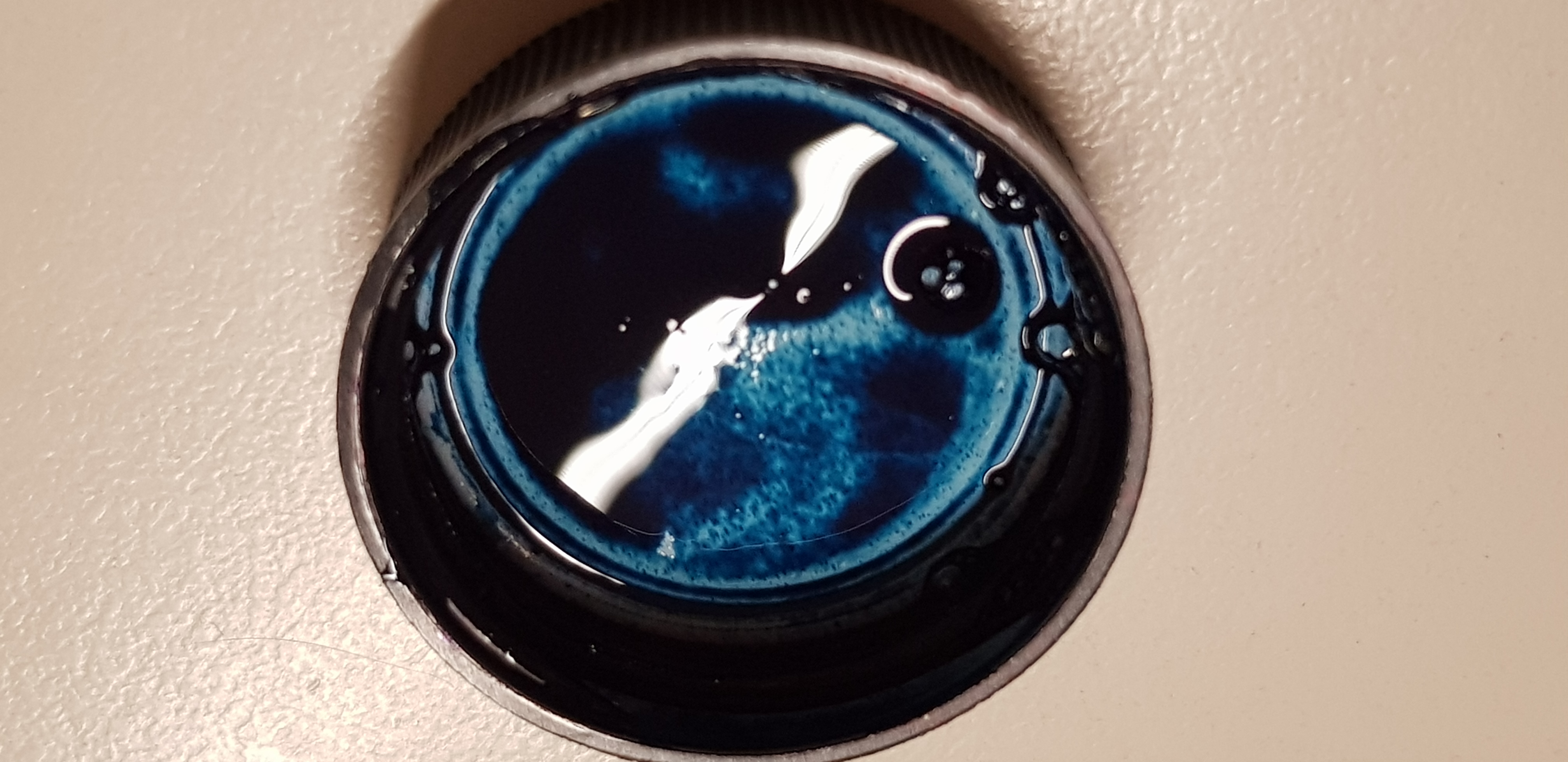 spero qui si veda meglio... comunque lo trovo piatto (la boccetta l'ho agitata bene tanto che il colore sotto al tappo è blu)