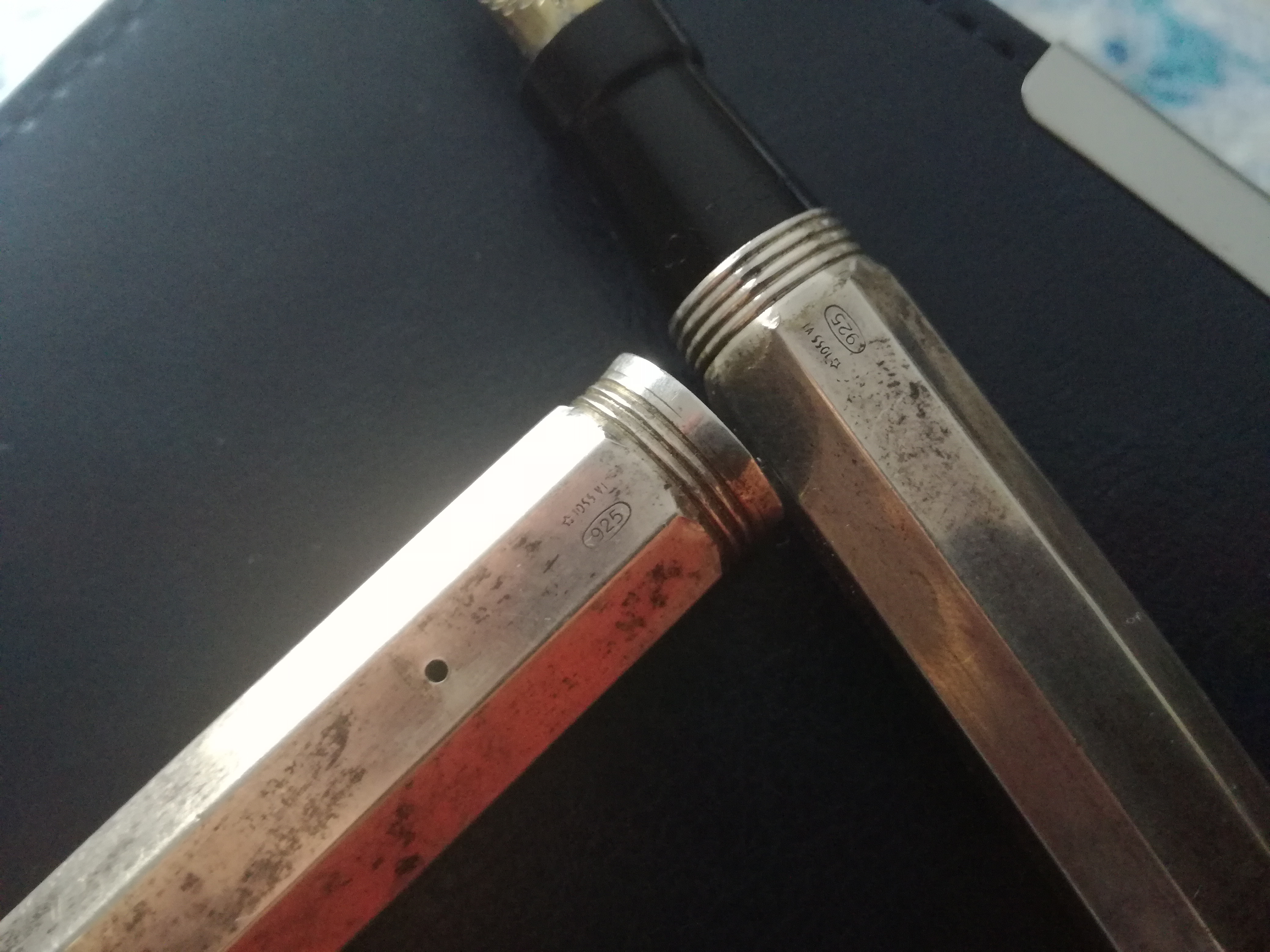 Ho preso questa penna ad un mercatino e mi farebbe piacere sapere qualcosa sulla penna. Ha sia il corpo che il cappuccio con timbro argento 925. Sul pennino si erge la scritta Montegrappa 525. Si sa l'anno di produzione? Approssimativamente il valore? (Solo in teoria perché mi piace molto e me la tengo stretta) purtroppo non ha la clip sul cappuccio. Spero che di ricevere qualche indicazione, perché oltre alla bellezza della penna brancolo nel buio. Grazie in maniera anticipata