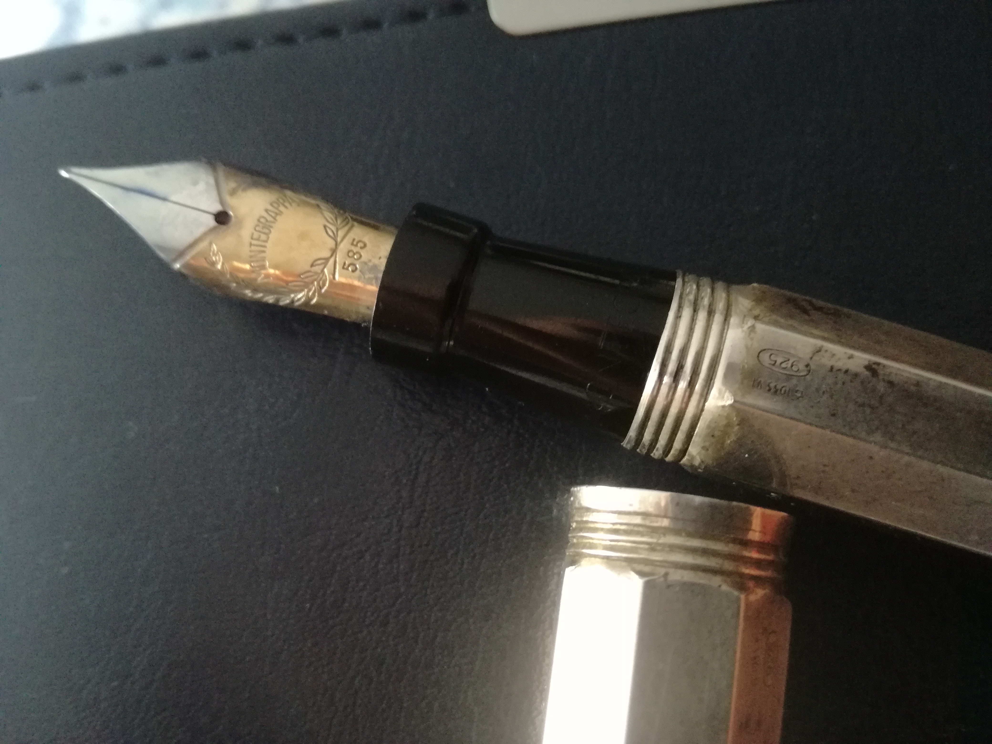 Ho preso questa penna ad un mercatino e mi farebbe piacere sapere qualcosa sulla penna. Ha sia il corpo che il cappuccio con timbro argento 925. Sul pennino si erge la scritta Montegrappa 525. Si sa l'anno di produzione? Approssimativamente il valore? (Solo in teoria perché mi piace molto e me la tengo stretta) purtroppo non ha la clip sul cappuccio. Spero che di ricevere qualche indicazione, perché oltre alla bellezza della penna brancolo nel buio. Grazie in maniera anticipata