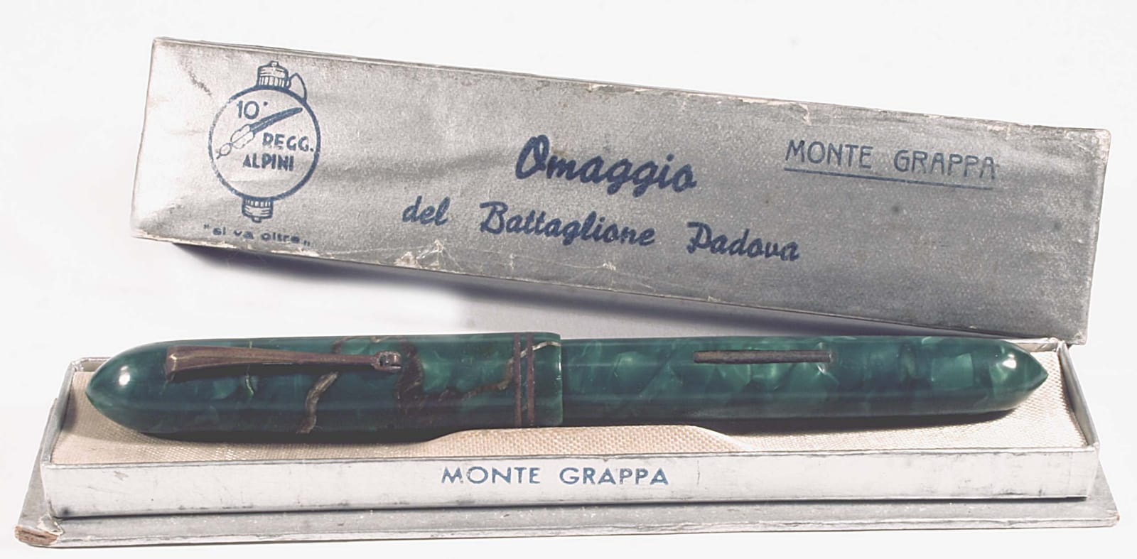 Monte Grappa anni ’40 per il 10° Alpini (Battaglione riservisti). Sull'astuccio particolare di notevole rilevanza storica: il logo del Decimo, con quel motto poi, oscura quasi del tutto il fascio. Impensabile qualche anno prima...