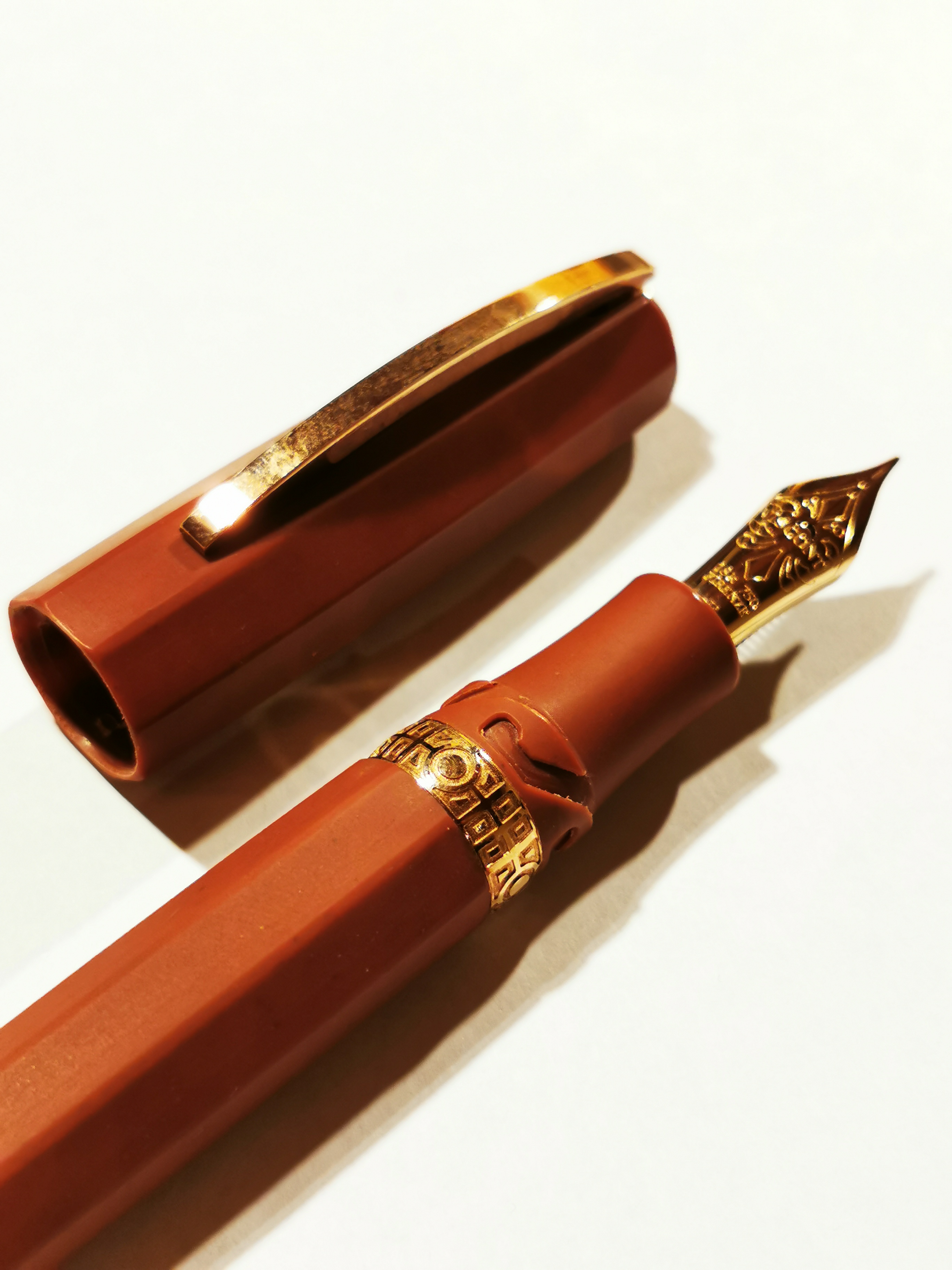 Il materiale è un composto di resina e cotto, di uno stupendo color cotto, un po' più caldo ed intenso del cotto tradizionale. Il pennino a differenza di quanto riportato nelle istruzioni, è in oro 18Kt e non in palladio 950 dreamtouch, in quanto questo pennino presentava alcuni problemi.