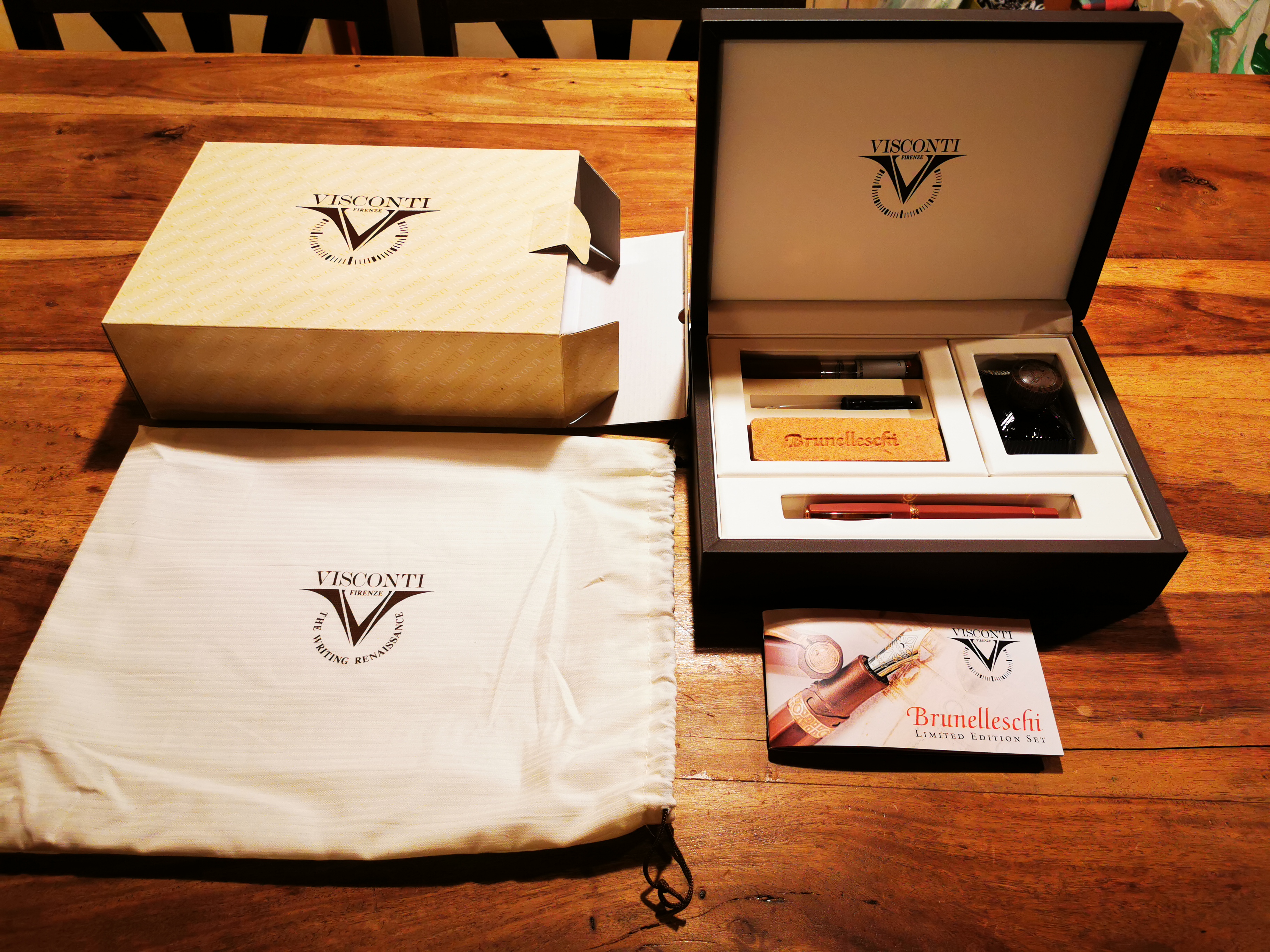 Aprendo la scatola si trova il libretto della penna con il relativo tagliando di garanzia, il mattoncino in cotto, la penna stessa, il calamaio da viaggio, con il suo contagocce a matita per il riempimento e il calamaio con l'inchiostro (Marrone/Seppia).
