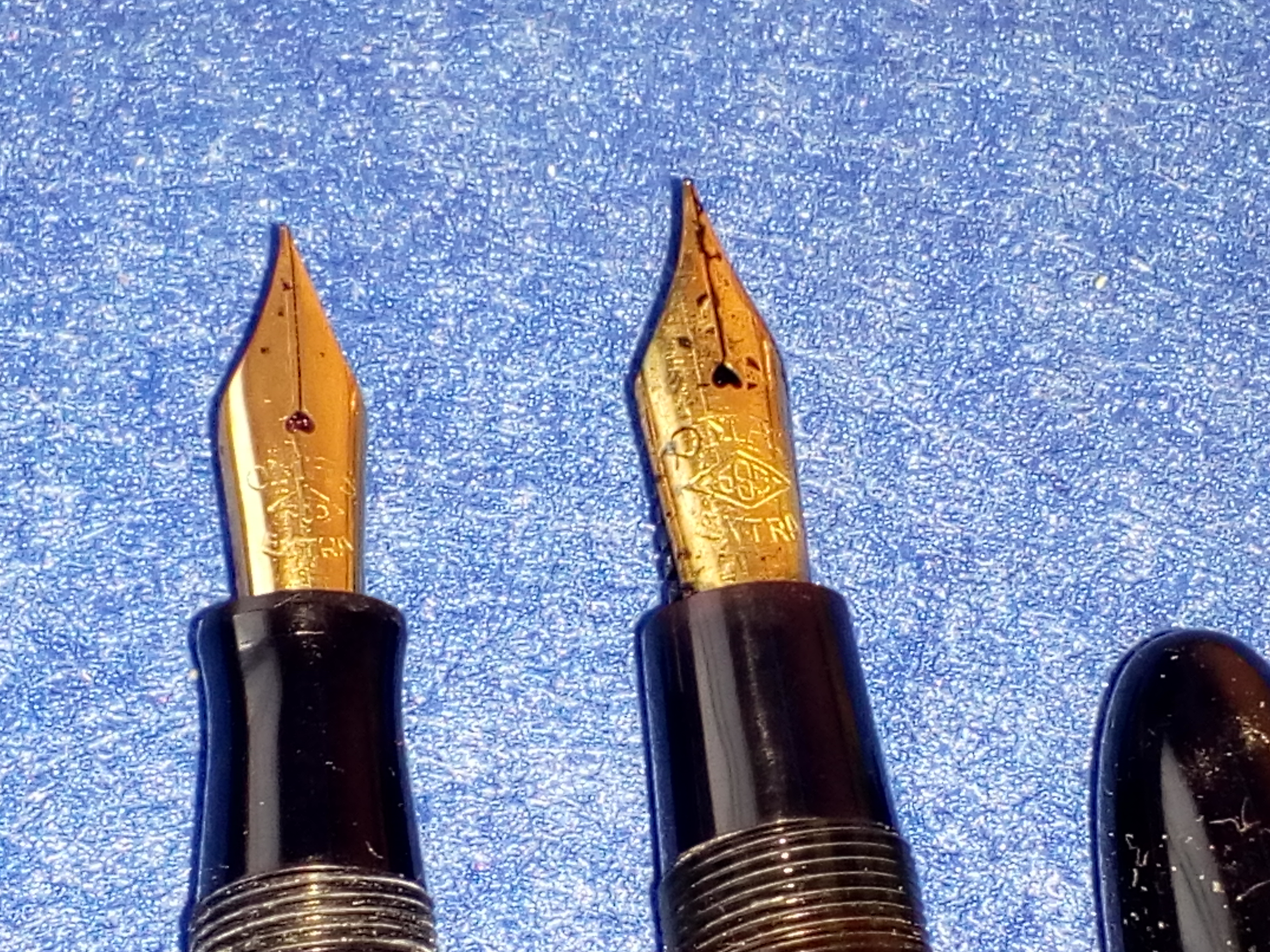 Pennini in oro con foro a cuore, di taglia inferiore per la media, certamente flessibili a giudicare dalla variazione di tratto che si ottiene con una minima pressione. Non avendo mai primo d'ora usata una flessibile non so qualificarli meglio, se cioè siano flex, semiflex o cos'altro.