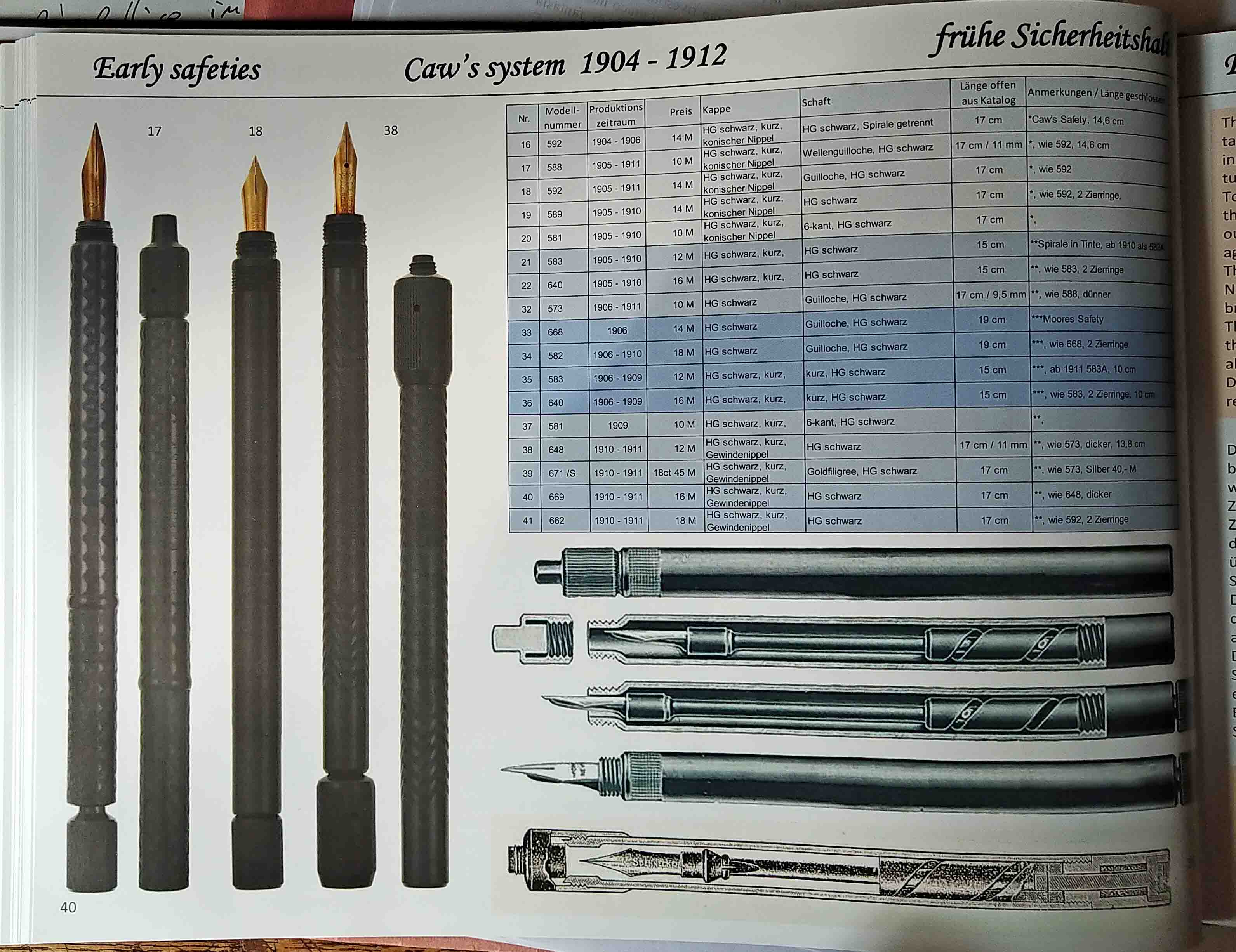 Ne traduco la parte che ci interessa, il libro è in tedesco ed inglese: inizialmente descrive il funzionamento delle penna safety poi “il primo modello utilizzato fu la Americana Caw’s safety, venduta in Germania sin dal 1899 per il tramite della società Schwan di Norimberga, il cui sistema di funzionamento venne adattato dalla Kaweco, Montblanc e Soennecken, la Montblanc la vendeva col subbrand Diplomat, la Kaweco dal 1906 denominandola System Caw ed anche solo Kaweco, la Soennecken dal 1900 col suo stesso nome. Questi primi modelli hanno tutti il cappuccio molto corto.”