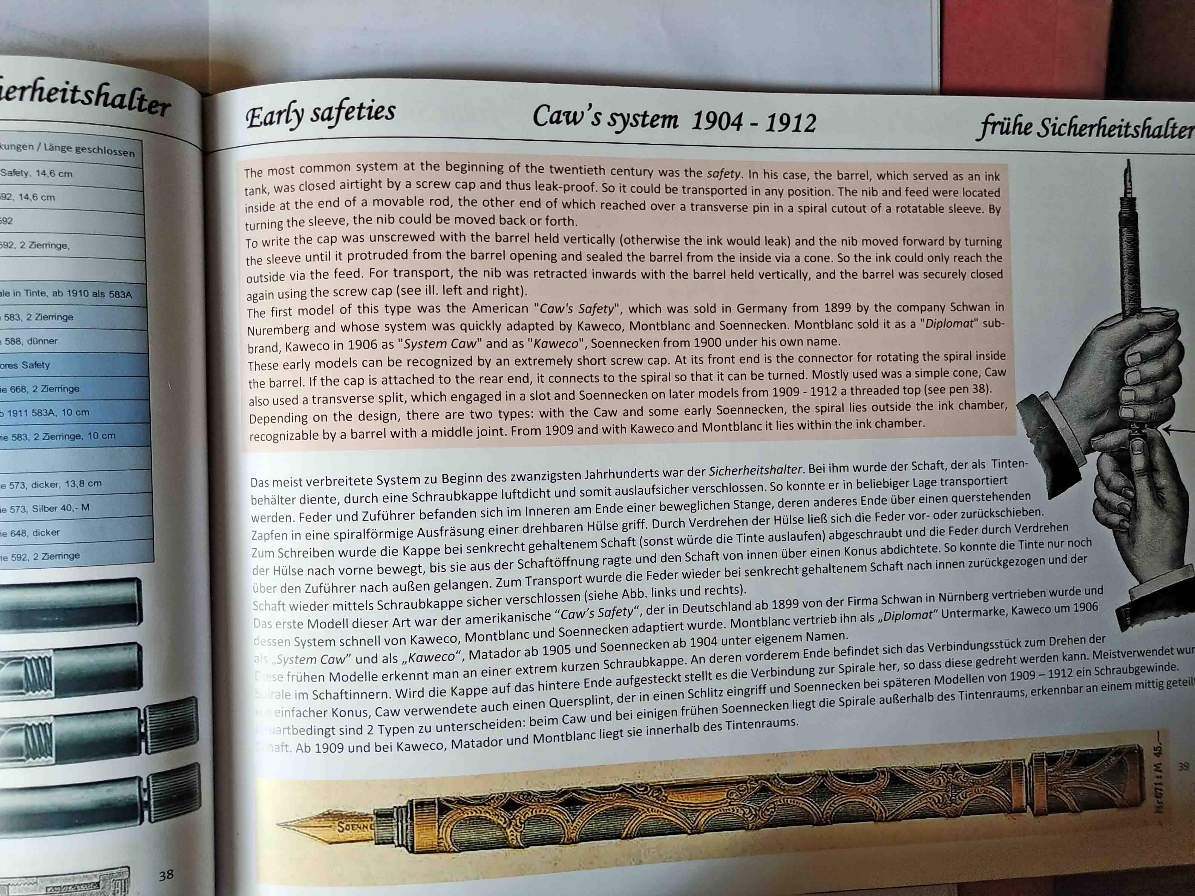 Ne traduco la parte che ci interessa, il libro è in tedesco ed inglese: inizialmente descrive il funzionamento delle penna safety poi “il primo modello utilizzato fu la Americana Caw’s safety, venduta in Germania sin dal 1899 per il tramite della società Schwan di Norimberga, il cui sistema di funzionamento venne adattato dalla Kaweco, Montblanc e Soennecken, la Montblanc la vendeva col subbrand Diplomat, la Kaweco dal 1906 denominandola System Caw ed anche solo Kaweco, la Soennecken dal 1900 col suo stesso nome. Questi primi modelli hanno tutti il cappuccio molto corto.”