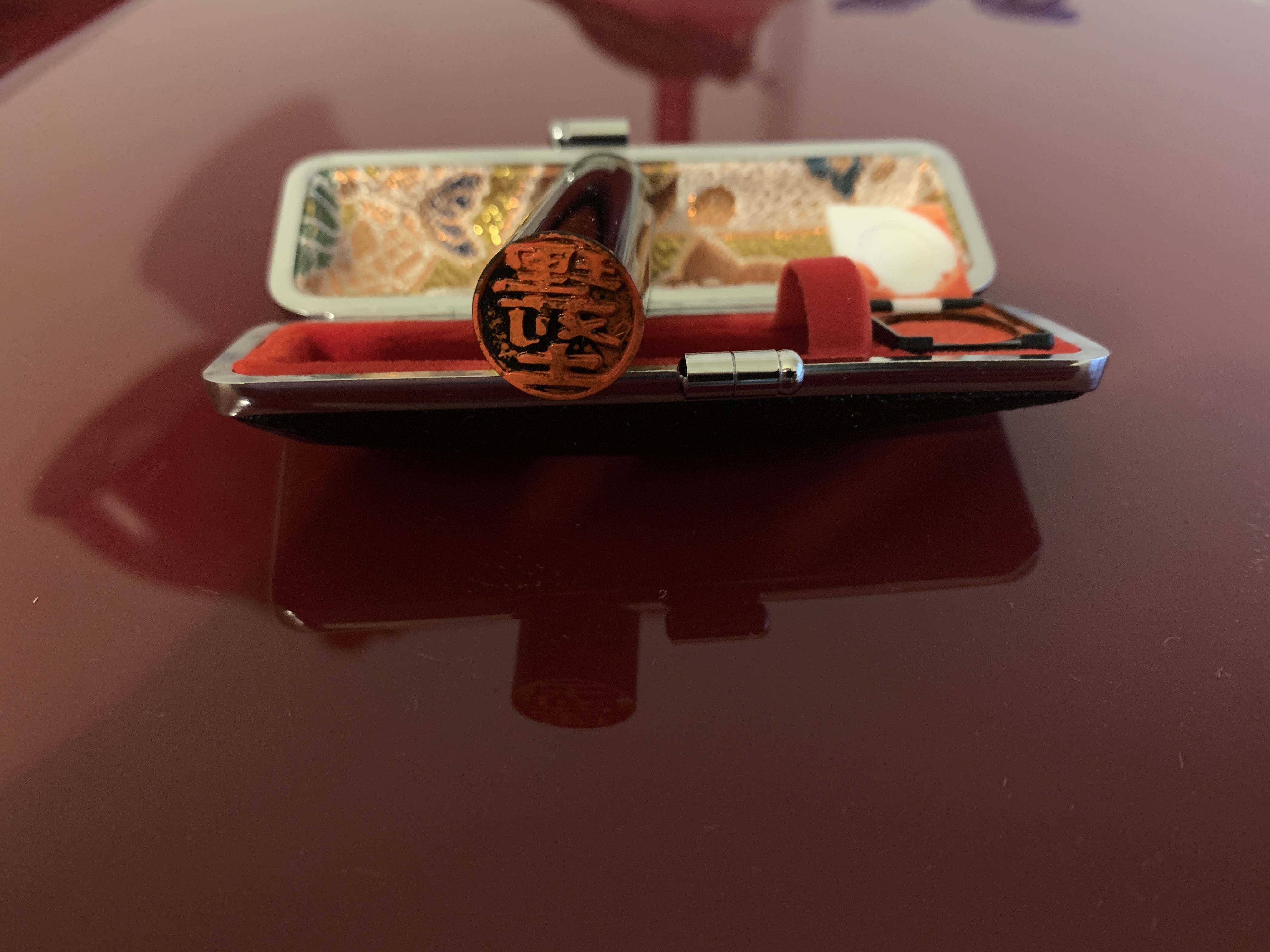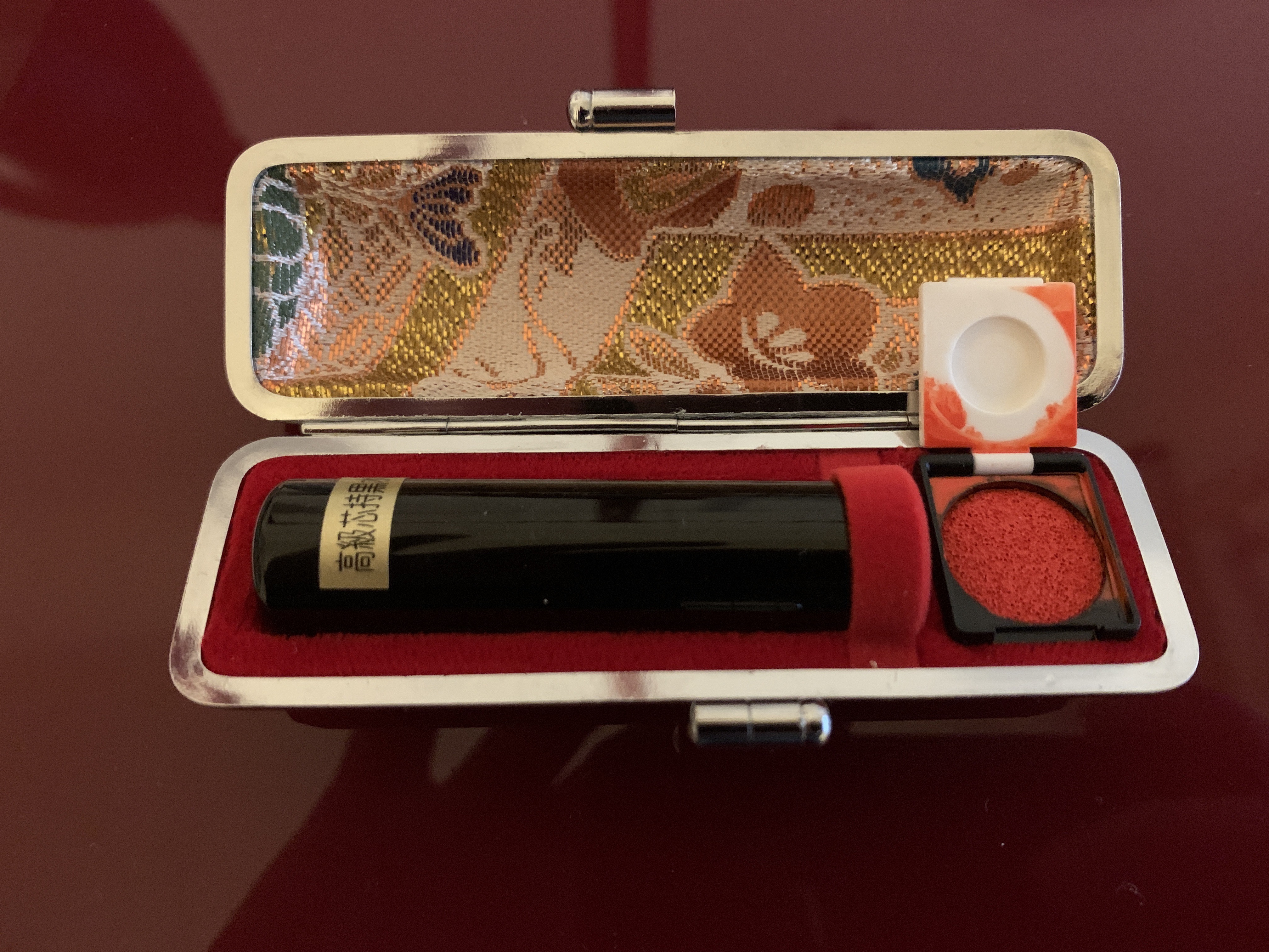 Al suo interno troviamo l’Hanko, delicatamente riposto, e un serbatoietto di inchiostro rosso.