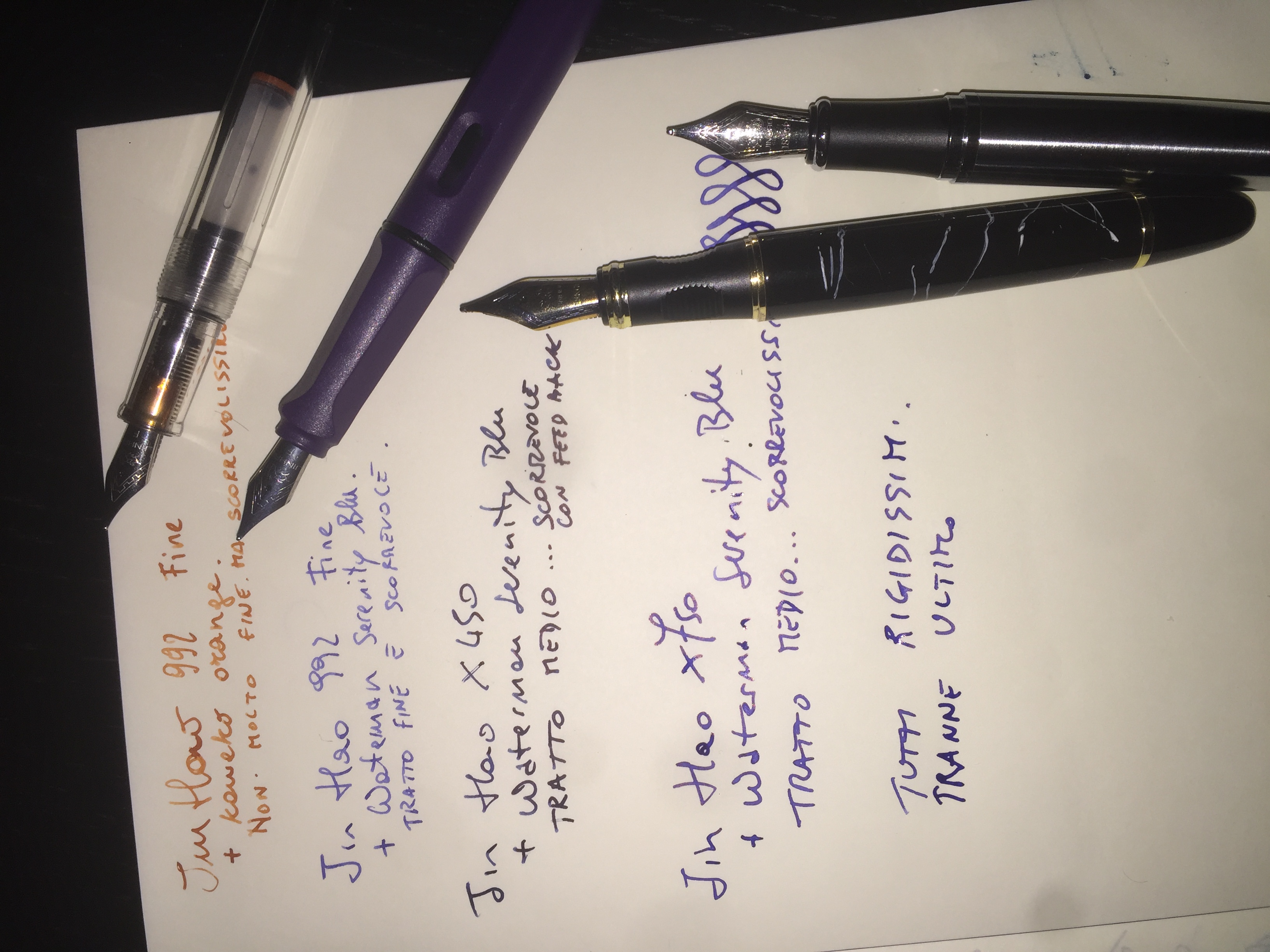 Si tratta di pennini che mi sono sgradevoli nell'uso, nel senso che proprio mi restituiscono una sensazione di scrittura "viscida" e spiacevole. Fino ad ora, ho trovato un solo pennino Jinhao decente (non un granché, ma non cattivo). Piuttosto che scrivere con un coso di quel genere, preferisco un buon roller gel, come la Pilot G2.