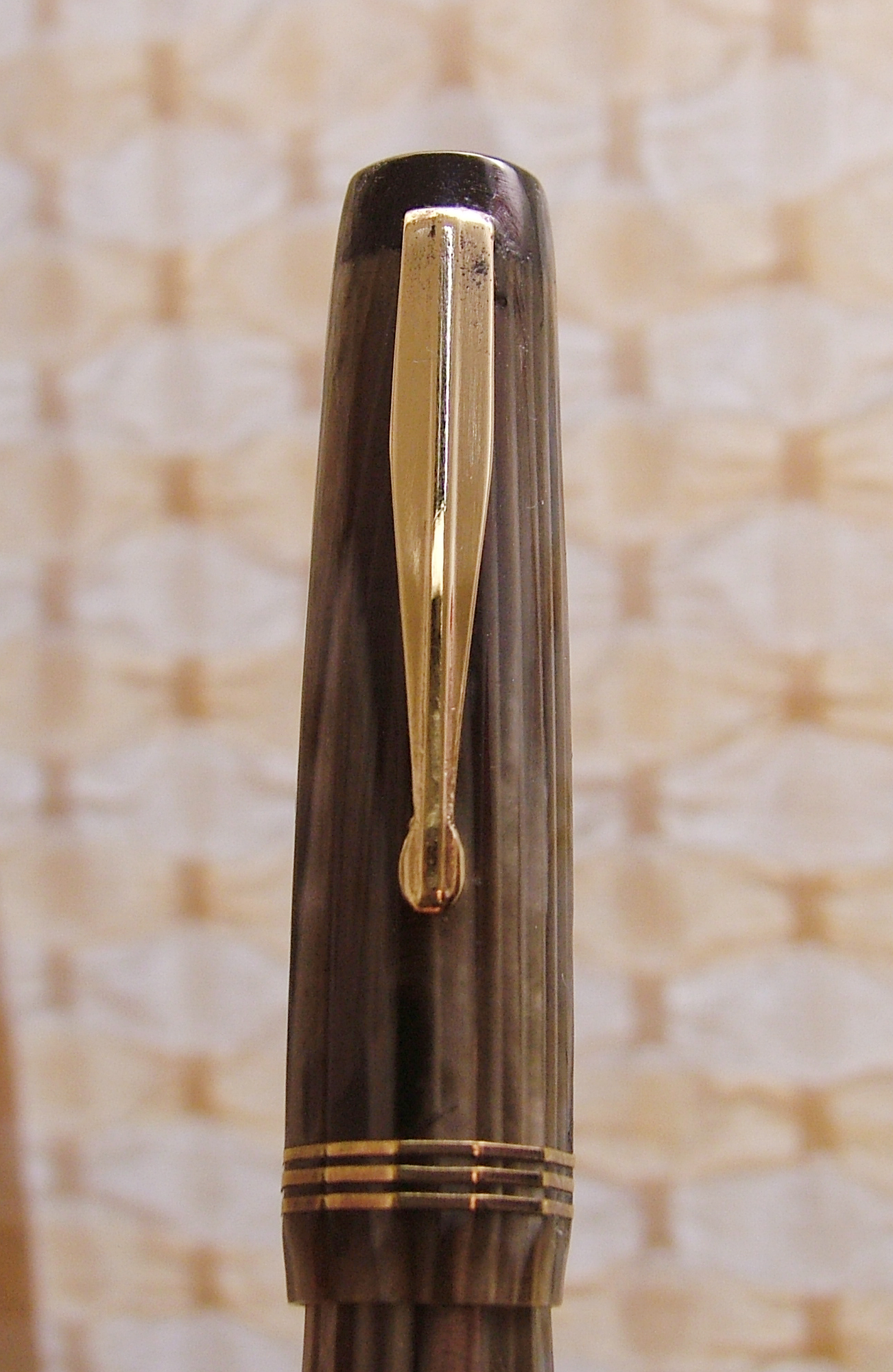 Ora, nella sua penna, tutte le "lamine" sono all'incirca uguali nel loro spessore, il che mi farebbe pensare che una celluloide "laminata" sia stata in qualche modo arrotolata e poi tornita. E' una cosa simile all'uso che Pelikan ha fatto della sua resina "tartaruga" per la replica "Tortoiseshell" della M101N. Le lamelle sono bellamente iridescenti, ma tutte dello stesso spessore, e anche in questo caso potrebbe trattarsi di una celluloide "arrotolata". Lei sa se questo si possa fare?