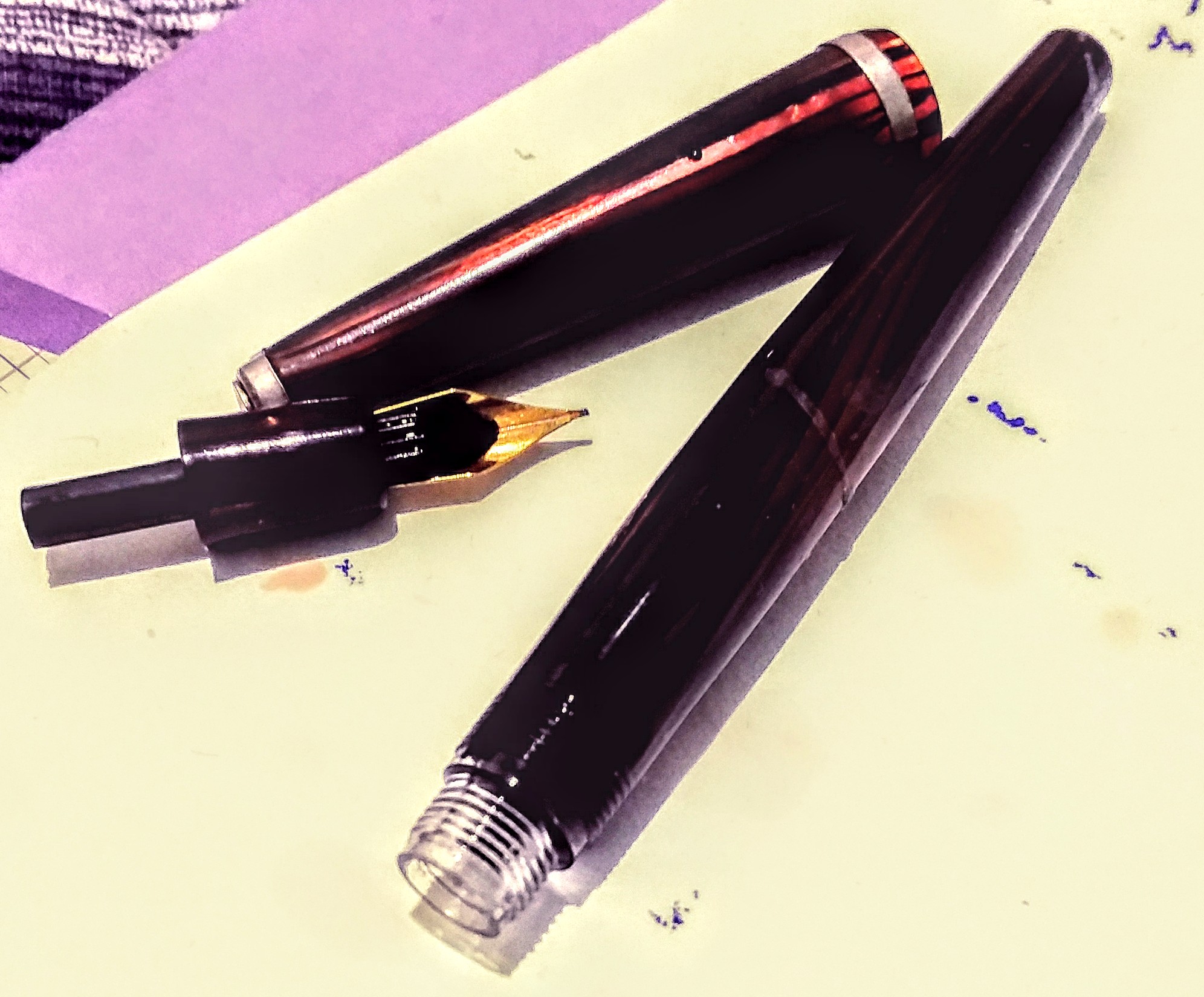 Credo che il lungo bagno abbia permesso al serbatoio di scivolare di nuovo abbastanza avanti (previo sbatacchiamento su un piano ) da permettere di reinserirsi nella filettatura ricevente del pennino.