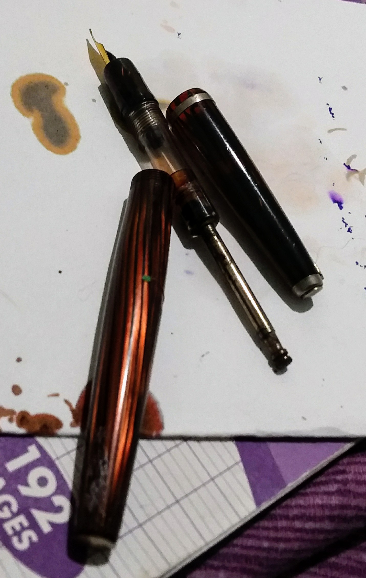 Prima di scrivere qui e chiedere lumi avevo messo il tutto a mollo in acqua e detersivi per i piatti per tutta la notte, sperando in qualche scioglievolezza, sembrava non aver funzionato. Dopo aver fatto la foto, ricompongo i miseri resti alla forma di penna intera. Svito di nuovo, tanto per, e il serbatoio è tornato al proprio posto!