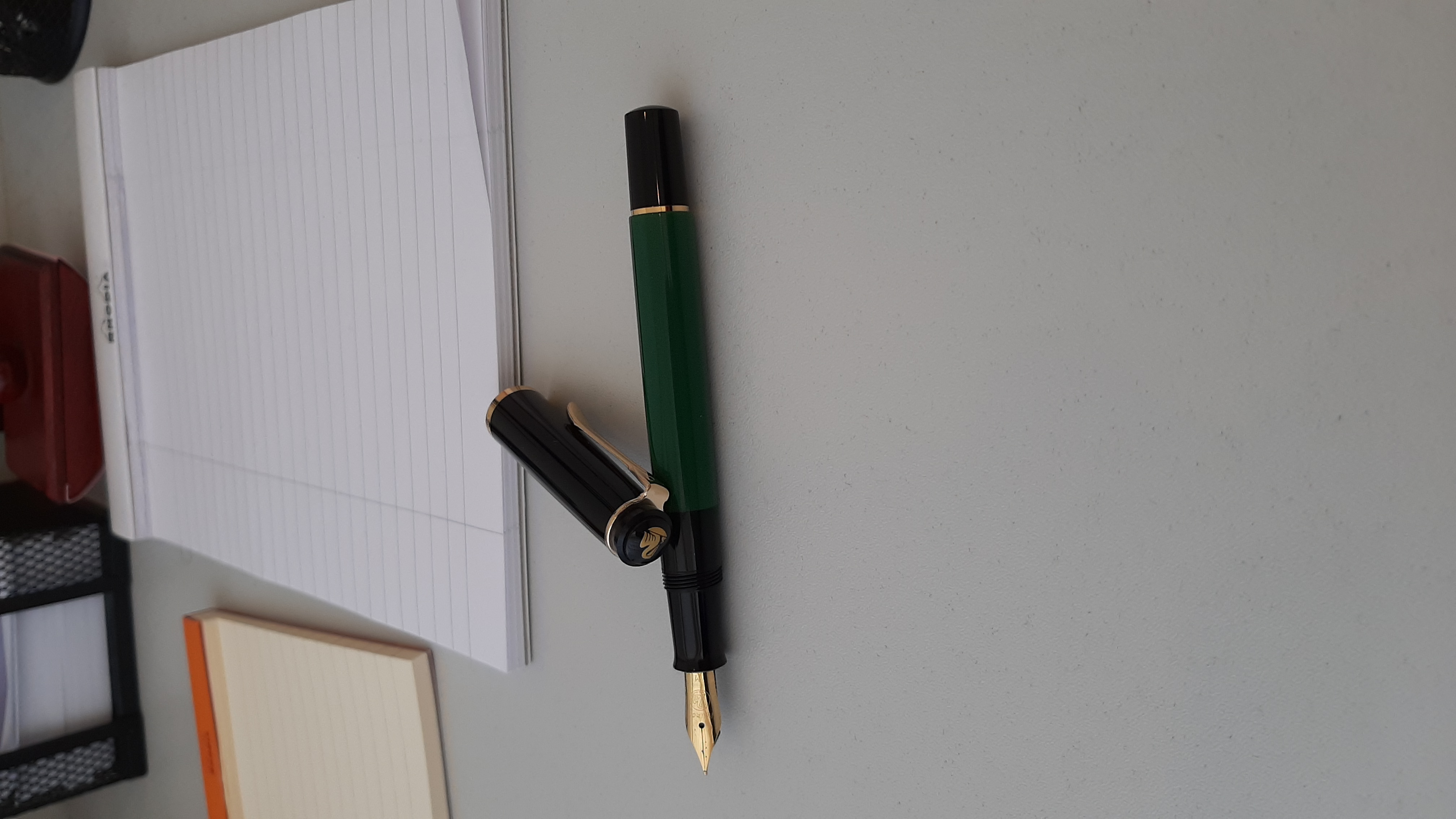 Confermo quanto dice Francesco. Eccola qui, è una M200 in nero/verde. Mi è arrivata oggi, inchiostrata e partita subito, pennino M assolutamente di nome e di fatto, quasi quasi abbastanza sottile. Ottima scorrevolezza, buoni materiali, insomma, una Pelikan.
