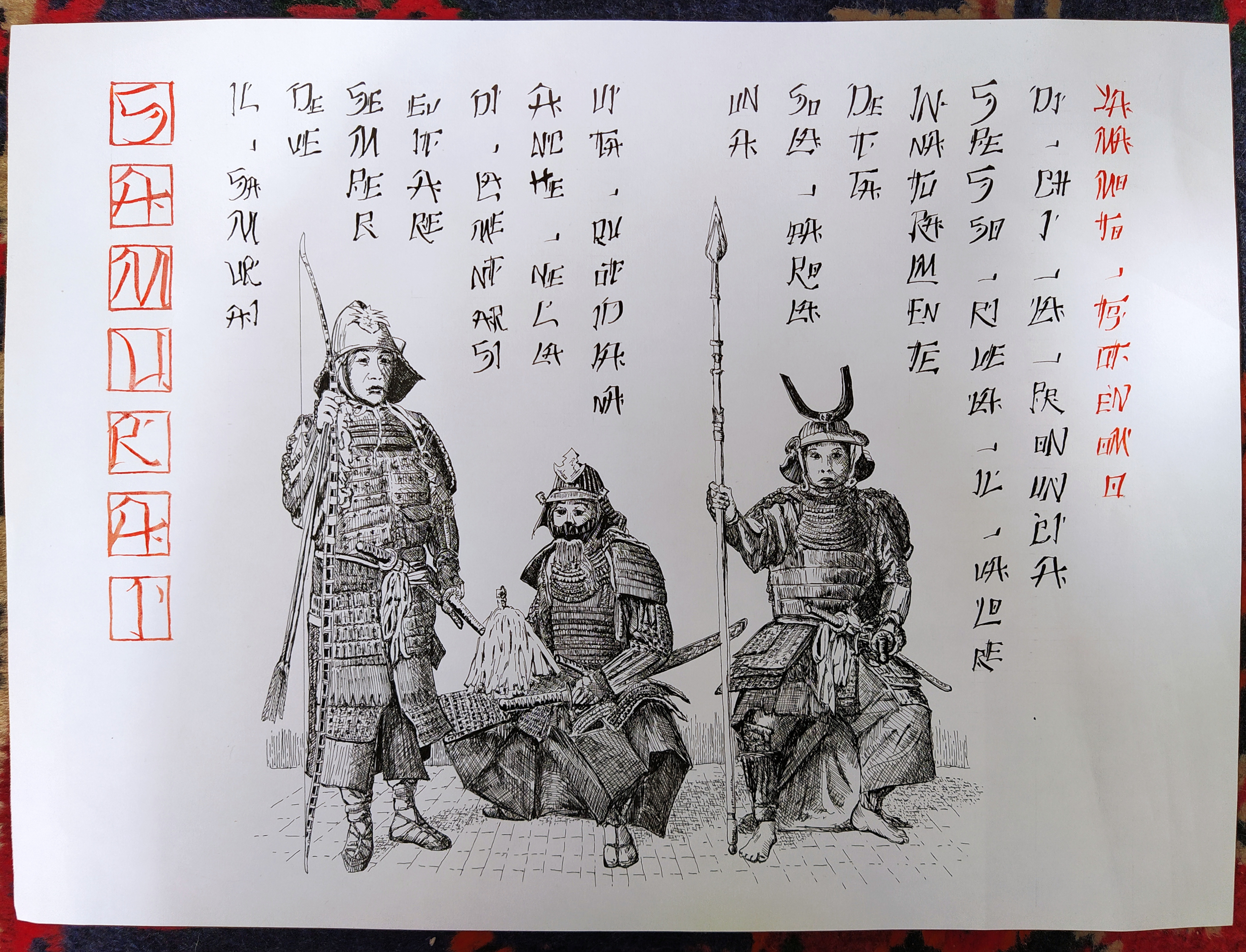 Allora il disegno e' MOLTO bello, quanto alla scrittura... piu' che giapponese assomiglia al Cinese. Un trucco relativamente semplice per distinguere le due lingue e' che in una frase Giapponese raramente non ci sono hiragana dentro mischiati ai Kanji mentre nel cinese sono tutti Hanzi (ovvero l'equivalente, spesso lo stesso ideogramma, dei Kanji). L'hiragana e' uno dei tre (si tre) alfabeti che i Giapponesi usano per scrivere e si usano assieme. Per farla corta gli Hiragana assomigliano molto ai Kanji ma sono molto semplificati, tre tratti o meno e, giusto per capirsi, sono l'alfabeto sillabico vero e proprio del Giapponese.