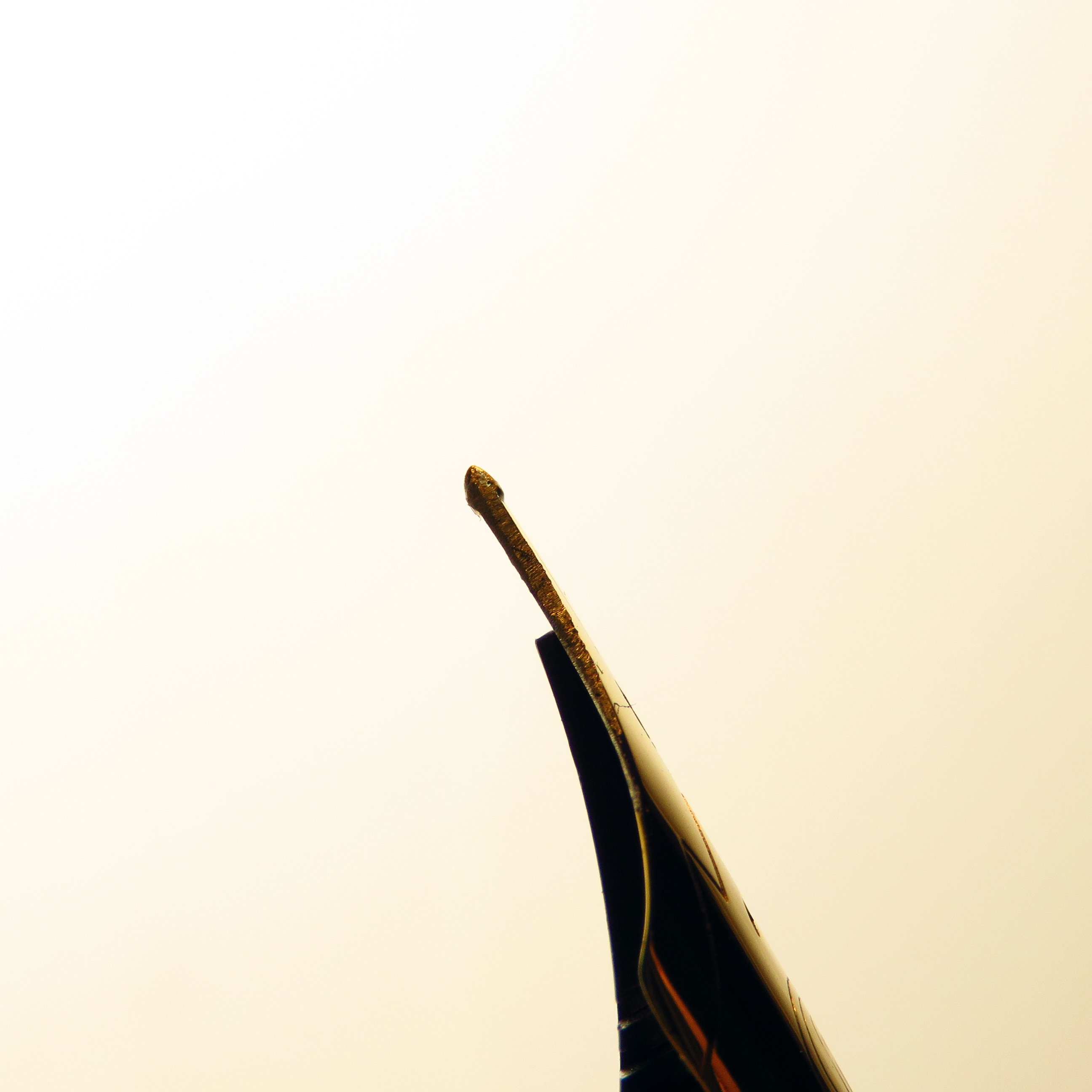Devo dire, poco male... a lavoro finito dopo aver eliminato tutte gli spigoli vivi ed aggiustato l'assetto, ciò che ne è risultato è stato un bel pennino, comunque molto sottile, scorrevolissimo e veloce. Non si impunta in nessuna direzione perchè sono riuscito a dare una forma soddisfacente alla superficie di contatto. Ho passato un pomeriggio intero a regolare il flusso apportando piccole modifiche alla distanza tra i rebbi (non è stato facile perchè ad un minimo aumento della distanza tra le punte c'era il rischio di far grattare gli spigoli interni dell'iridio con la carta) e scegliendo tra vari alimentatori "cinesi" a mia disposizione per ottenere la quantità di inchiostro desiderata. Alla fine ho optato per un flusso abbondante, il tratto ha mantenuto comunque un'elevata precisione.
