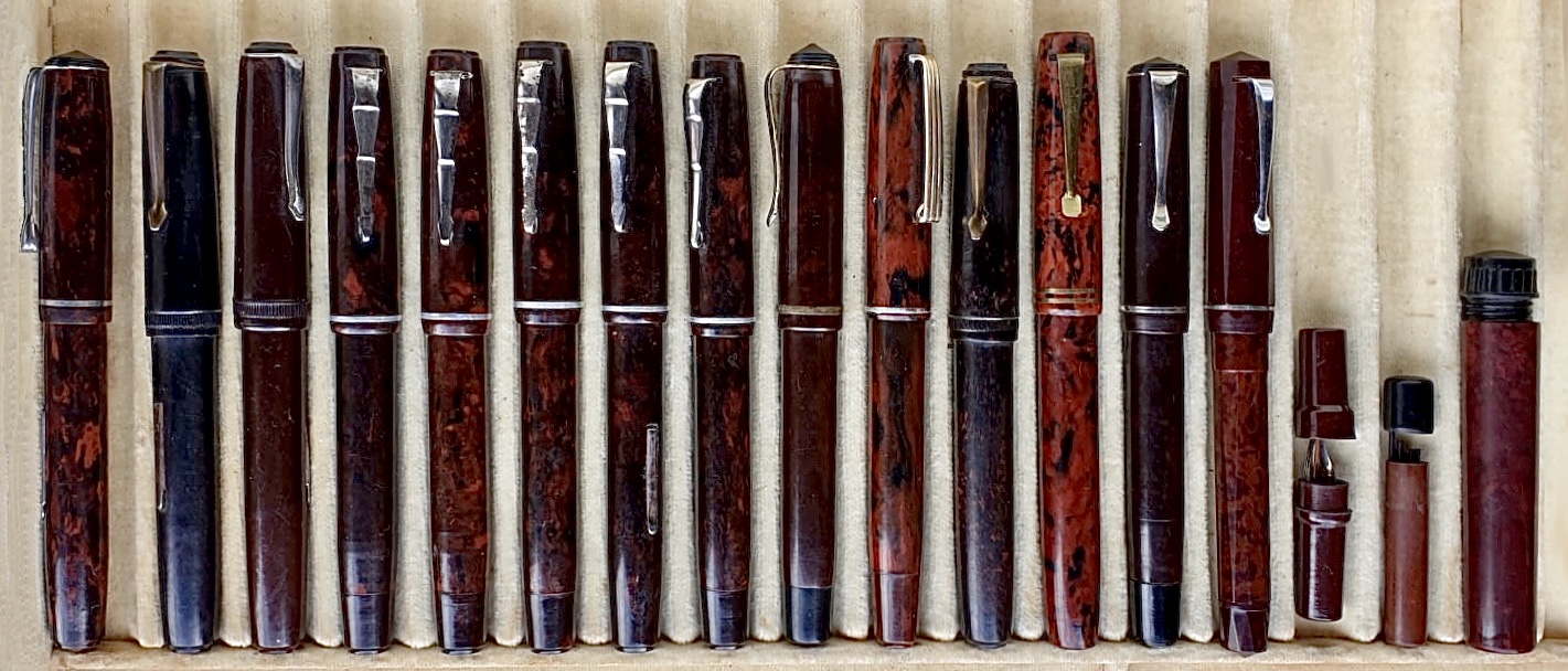 Christian (dalla terza all'ottava, da sin.), Stilomine Bayard (Francia, la dodicesima), Comfort pen (la decima), 08AJ (seconda, terza e undicesima) le marche delle penne di bakelite. Anonime le altre, ivi compresa la "robusta" sul sostegno di plexiglas.