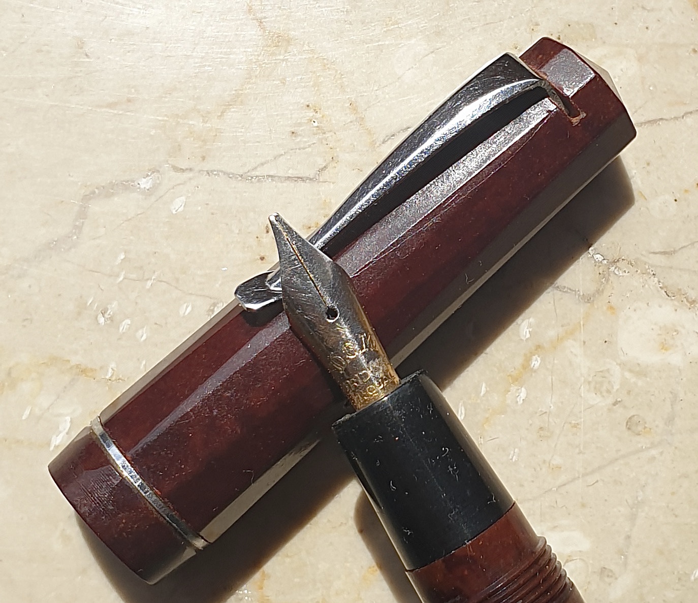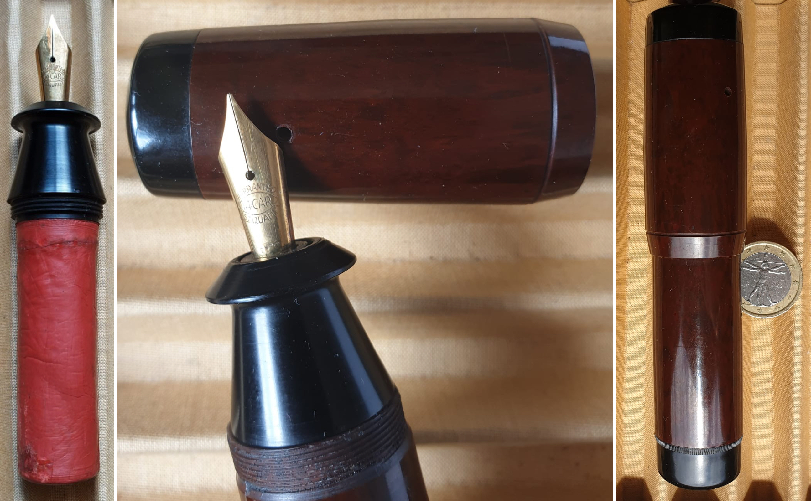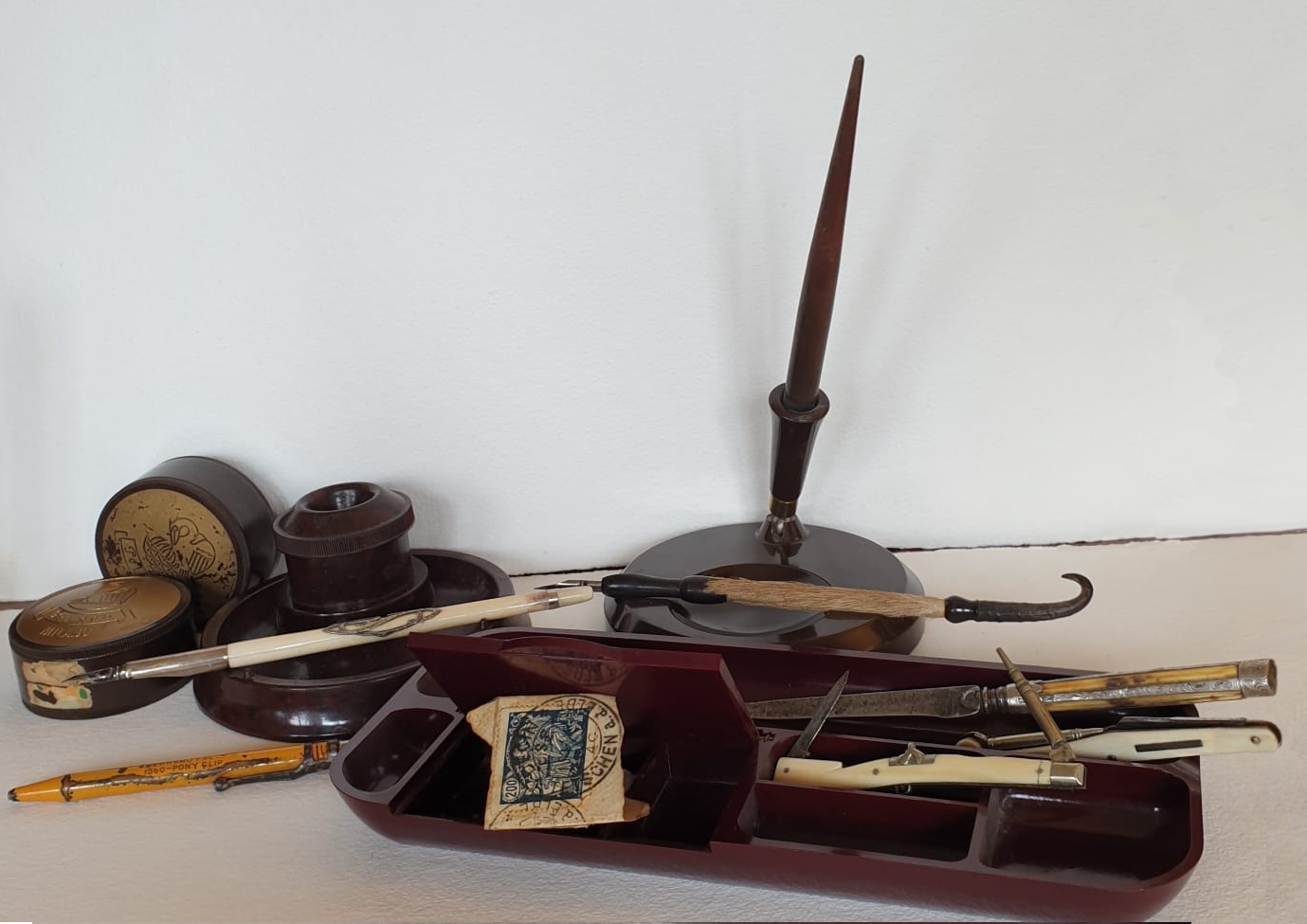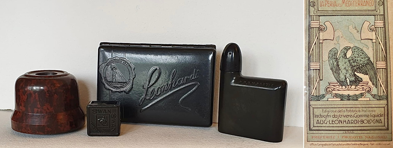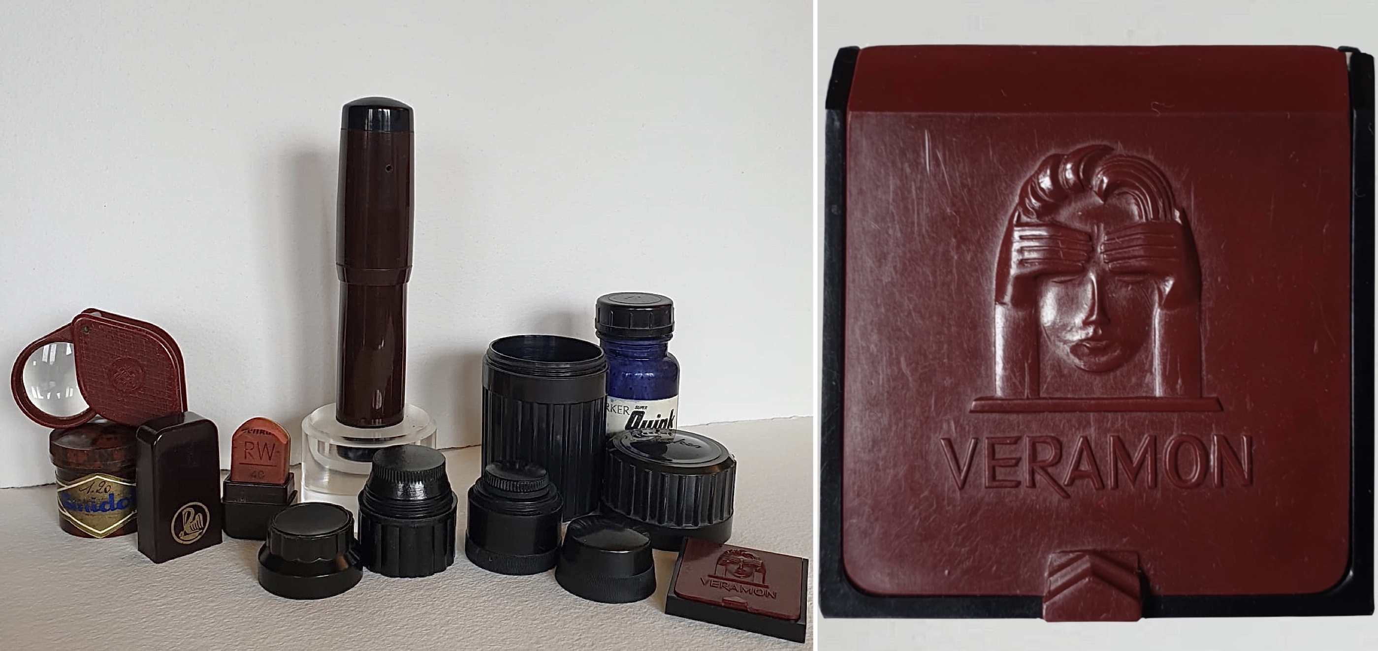 Rassegna di stilografiche ed altri oggetti di cancelleria da scrivania, realizzati in Bakelite, già perdente, nel nostro campo, vs l'ebanite e definitivamente KO con la celluloide. Materiale dalle particolari caratteristiche isolanti termoelettriche, sintetizzato nel 1907 da Leo Baekeland e definito come la prima materia plastica a base sintetica (la galalite era ottenuta a partire dalla caseina, quindi a base naturale). Tra penne, calamai, porta lenti, tempera matite, tagliacarte ed altro, si noti lo stupendo contenitore per le pastiglie Veramon contro il mal di testa, decorato con un bassorilievo di pregio artistico (realizzazione sconosciuta, forse disegnato dal futurista Fortunato Depero che, a fine anni ‘20, si occupò della campagna pubblicitaria del prodotto). Cosa c'entra? C'entra, c'entra: scrivere, spesso faceva venire l'emicrania...