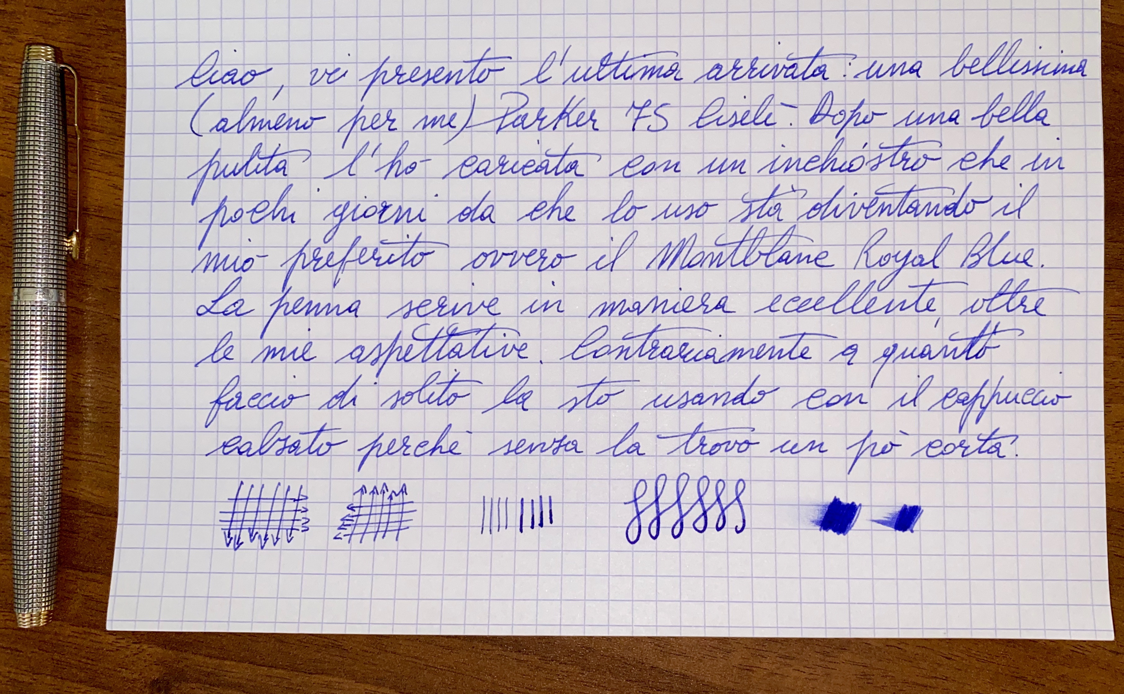 L’ho usata poco ovviamente, avrò scritto 4 o 5 pagine A4 e il pennino è morbido. Non come un “Soft” giapponese per intenderci, ma non è affatto un chiodo come tanti pennini in acciaio. Ad ogni modo la scrittura è assolutamente piacevole e il feedback veramente minimo ma allo stesso tempo NON dá quella spiacevole sensazione che scivoli via senza controllo. Avevo letto che scrivono bene ma sono rimasto lo stesso favorevolmente colpito. Come piacevolezza di scrittura secondo la mia percezione la posso tranquillamente paragonate all Pilot Custom 74 o alla Lamy 2000 anche se queste ultime hanno un’ergonomia migliore. La 75 è effettivamente piccolina. Sottile e corta. Non dico che sia scomoda da usare comunque, solo che per esempio io che di solito scrivo senza cappuccio con la 75 preferisco calzarlo e considera che non ho mani grandi.